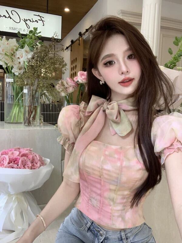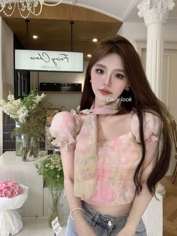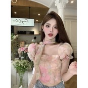 スクエアカラー、パフスリーブ、ワンショルダーシャツ、美しいプリント、ショート、スリム、オールマッチ、甘いシフォントップス、レディース夏 大人ガーリー スウィート キュート カジュアル サマー 夏物 スクウェア nana35596125431 | modepoisson