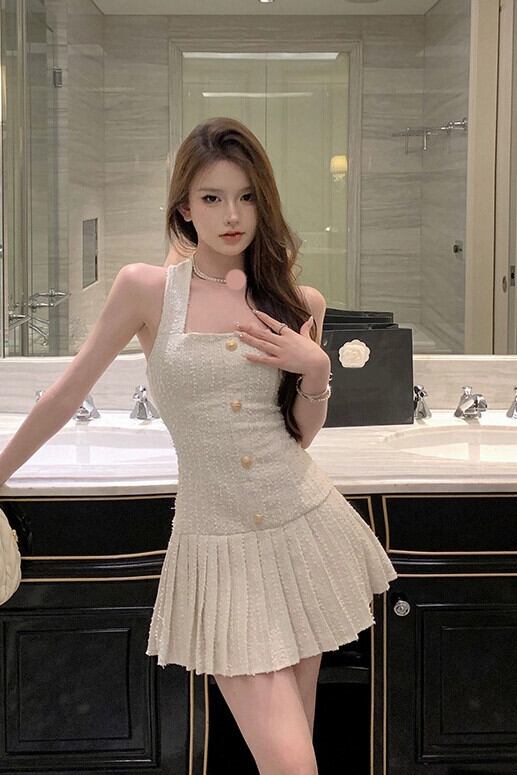 フレンチスリムホルターネックドレス甘いティーブレイクシックなユニークな気質プリーツスカート夏のサスペンダーショートスカート 大人ガーリー スウィート キュート カジュアル サマー 夏物 nana79392714043