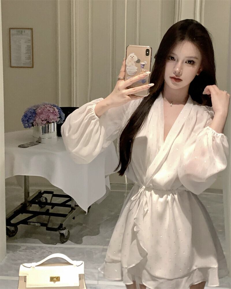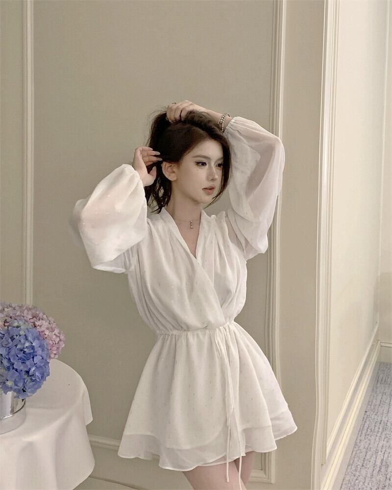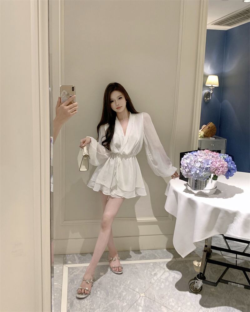 フレンチスタイルの白いドレス気質妖精スカート長袖ウエストウエストスリムハイセンスショートスカート女性の夏の新しいスタイル ロング ホワイト サマー 夏物 nana91462010147 | modepoisson