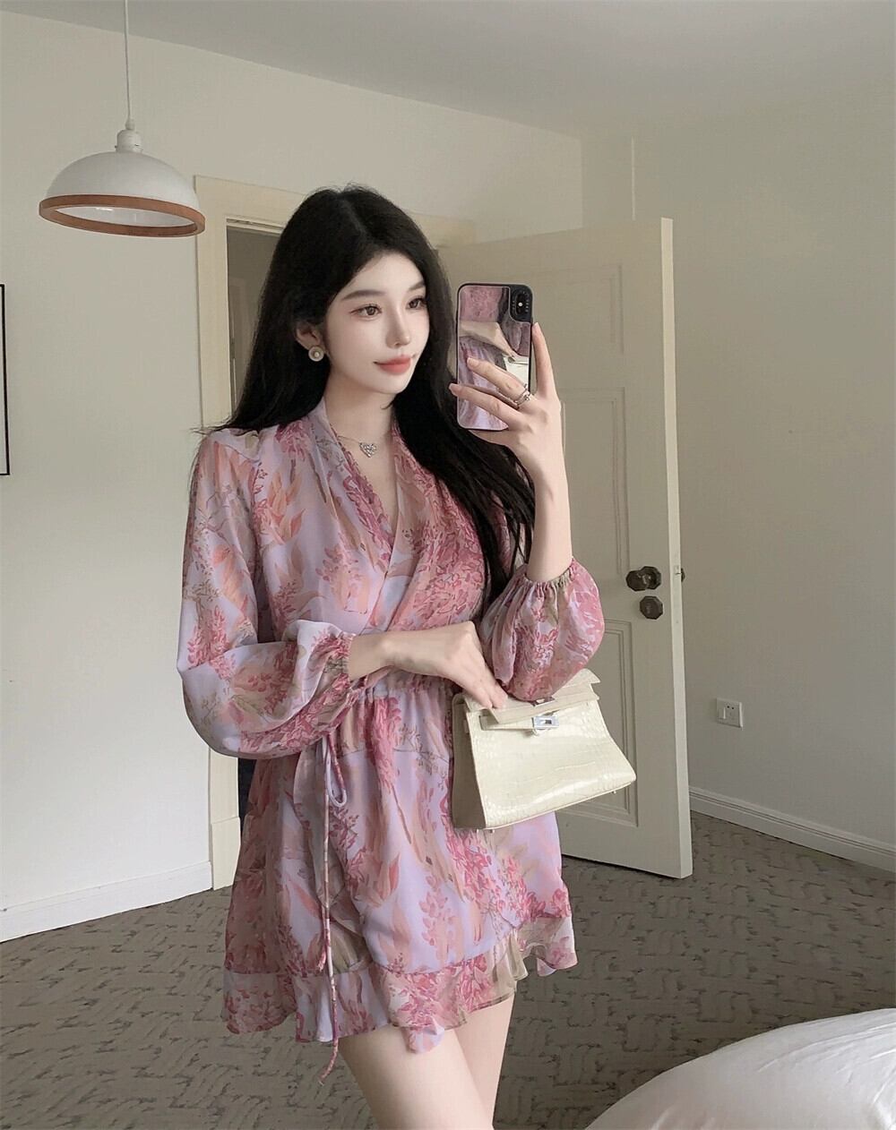パフスリーブウエスト痩身ドレス女性の夏フランスの美しいプリントセクシーな V ネック長袖シフォンショートスカート ロング サマー 夏物 Vネック nana19594430941 | modepoisson