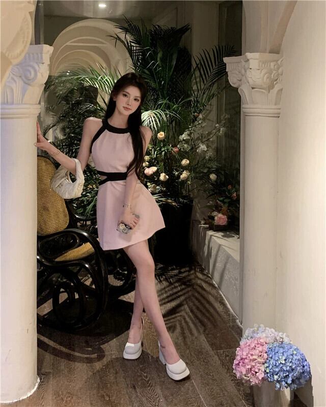Xiaoxiangfeng ピンクノースリーブホルターネックドレス夏 2023 新しいハイエンドの甘い a ラインショートスカート 大人ガーリー スウィート キュート カジュアル サマー 夏物 Aライン nana98132238986 | modepoisson