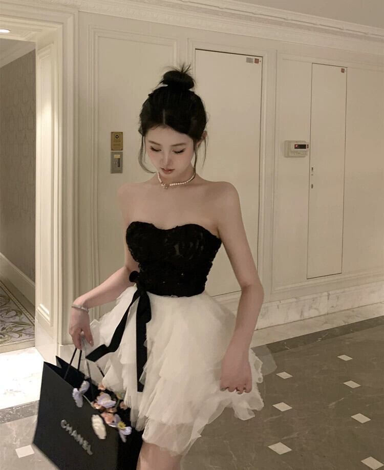 ワンショルダーチューブトップドレス女性、夏のハイエンド気質ドレス、ショートスカート、ノースリーブスプライシングメッシュプリンセスドレス サマー 夏物 nana88909542882 | modepoisson
