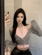 フレンチホルターネックニットカーディガン偽ツーピースデザインニッチスリムフィットトップ女性の秋と冬の痩身ボトリングシャツ オータム 秋物 ウィンター 冬物 nana88678048857 | modepoisson