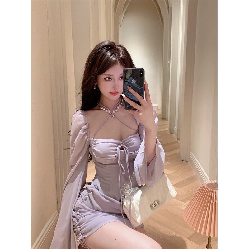 純粋な欲望スクエアネックホルターネック長袖シフォンスカート夏フレンチニッチ気質巾着プリーツヒップドレス女性 ロング サマー 夏物 スクウェア nana66483152792 | modepoisson