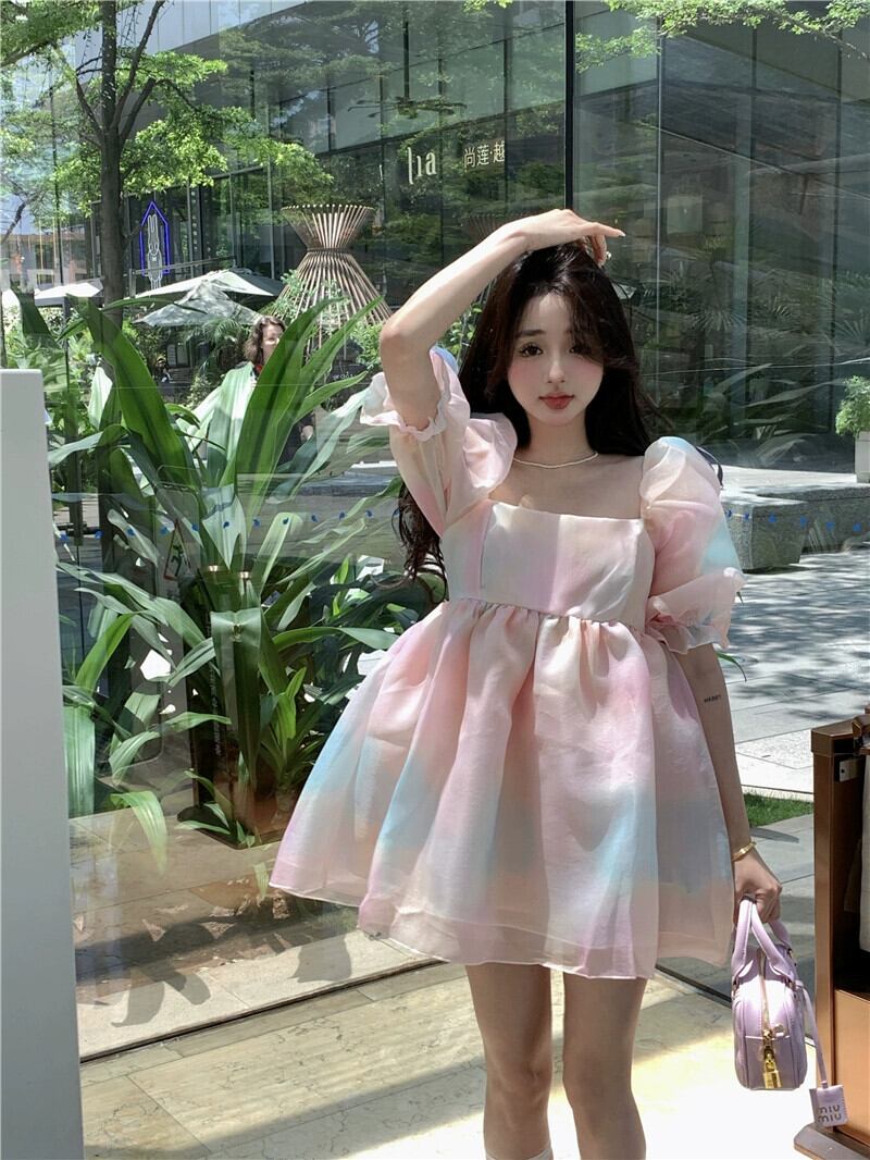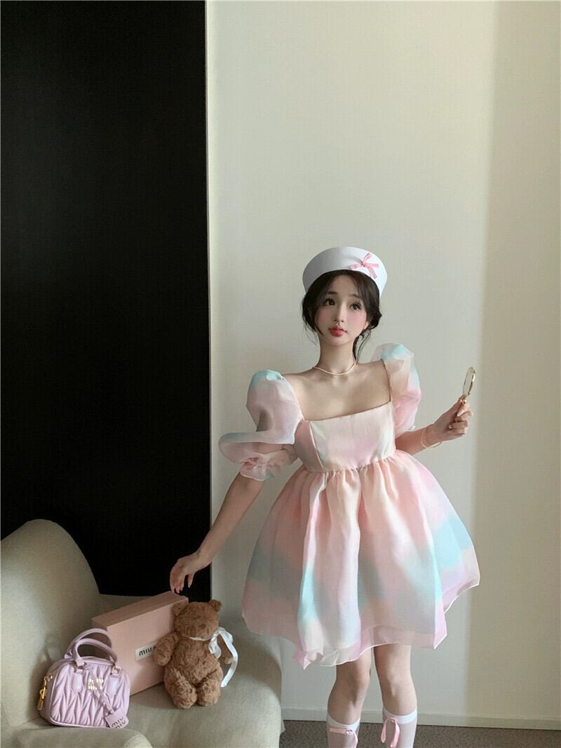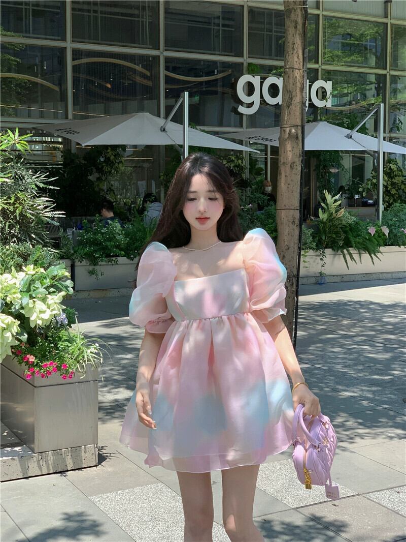 パフスリーブの美胸ドレス、フレンチスイートなふわふわプリンセスドレス、オーガンジードレス、夏のウエストを締める妖精ドレス 大人ガーリー スウィート キュート カジュアル サマー 夏物 nana85422512424 | modepoisson