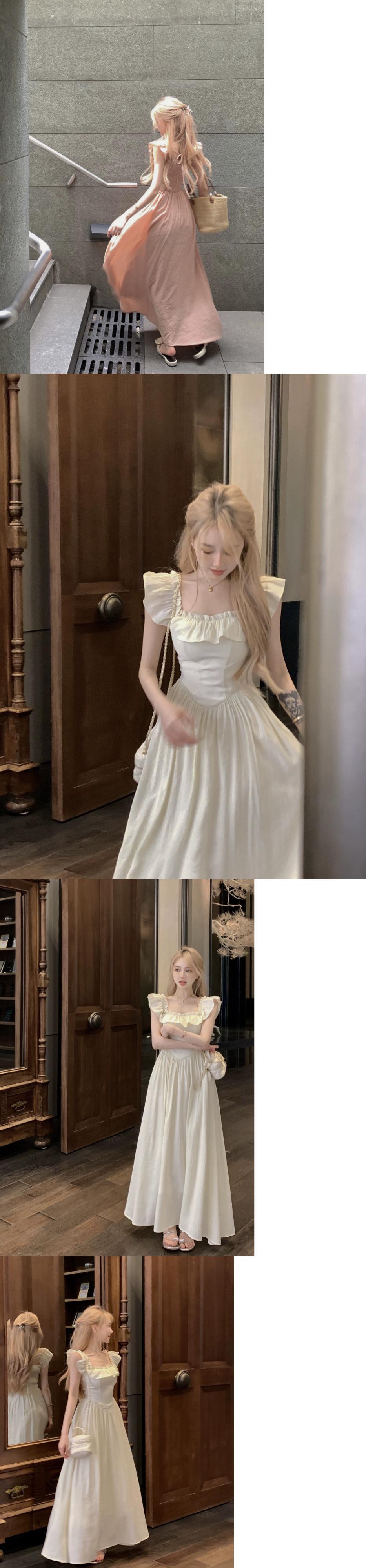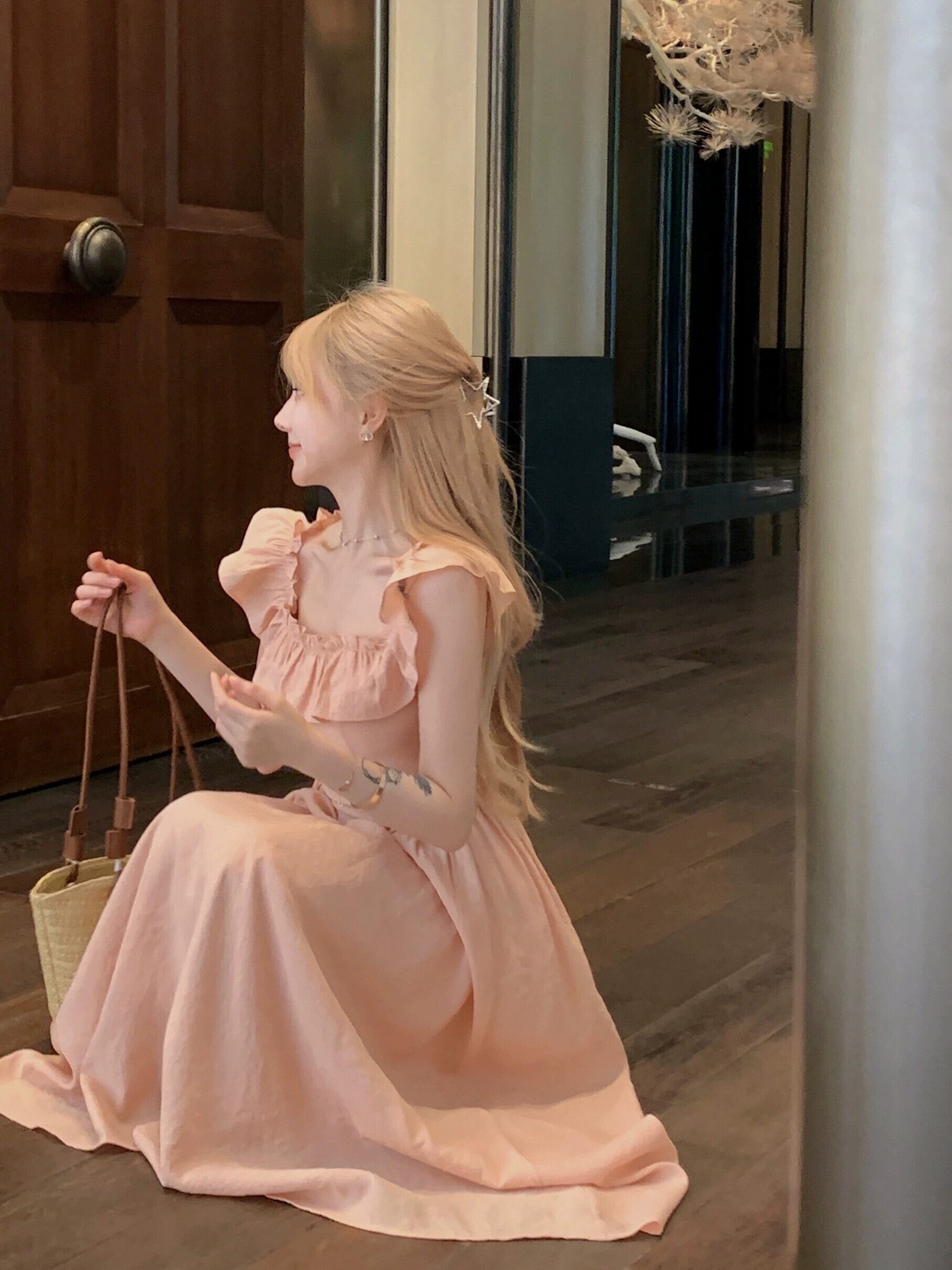 フレンチフリルスクエアネックスイートドレス、ウエスト痩身とハイエンドロングスカート女性夏休みサスペンダースカート 大人ガーリー スウィート キュート カジュアル サマー 夏物 スクウェア nana2567587840 | modepoisson