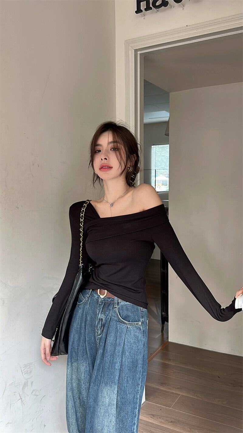 ホットガール純粋な欲望長袖スリム Tシャツ女性の初秋ボトリングシャツニッチシックな気質オフショルダータイトスリムトップ ロング オータム 秋物 ピュア nana54507387509 | modepoisson