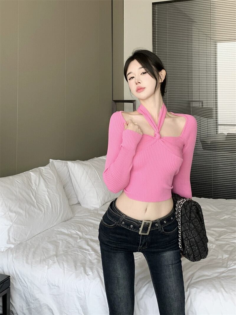 Hot のユニークなニッチホルターネックワンショルダーニットトップピンクドーパミン衣装秋と冬のショートボトムシャツ女性 オータム 秋物 ウィンター 冬物 nana51471613056 | modepoisson