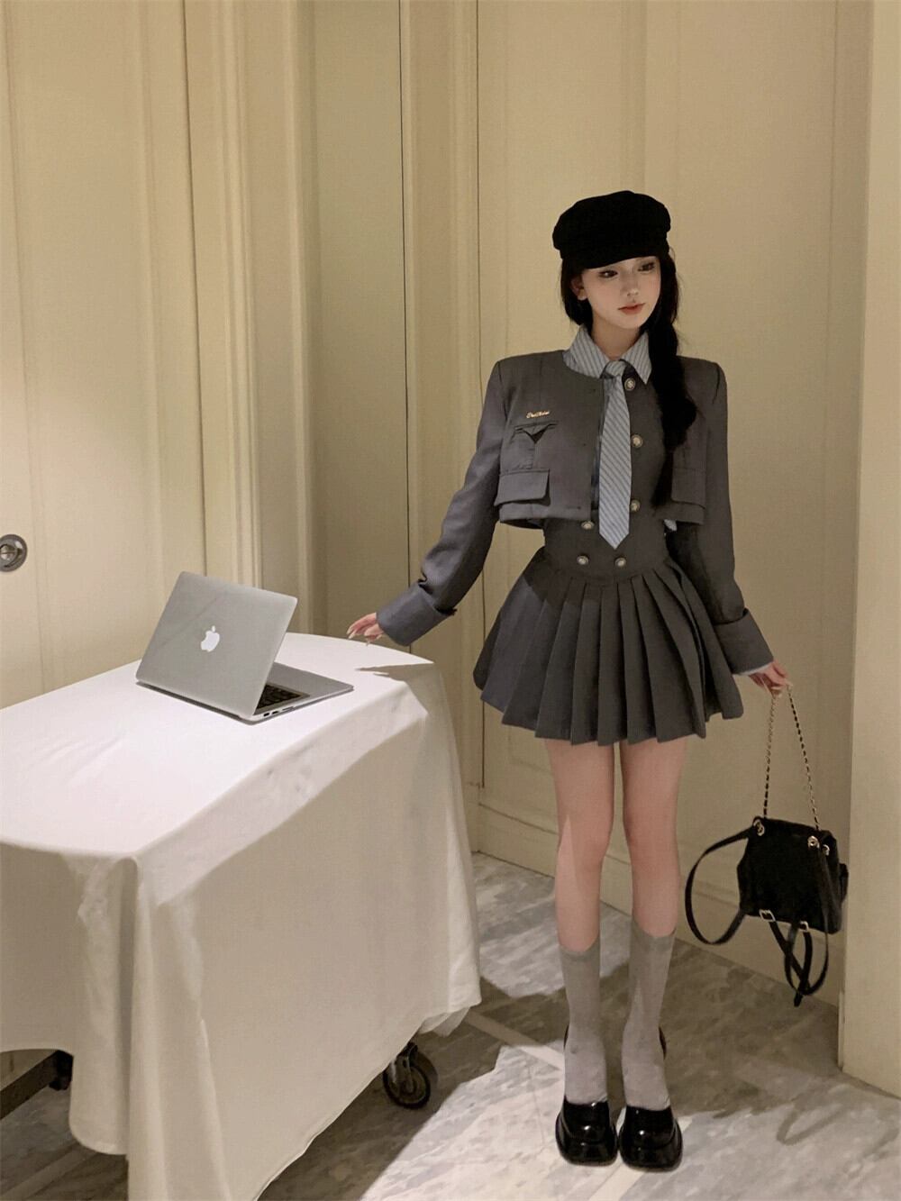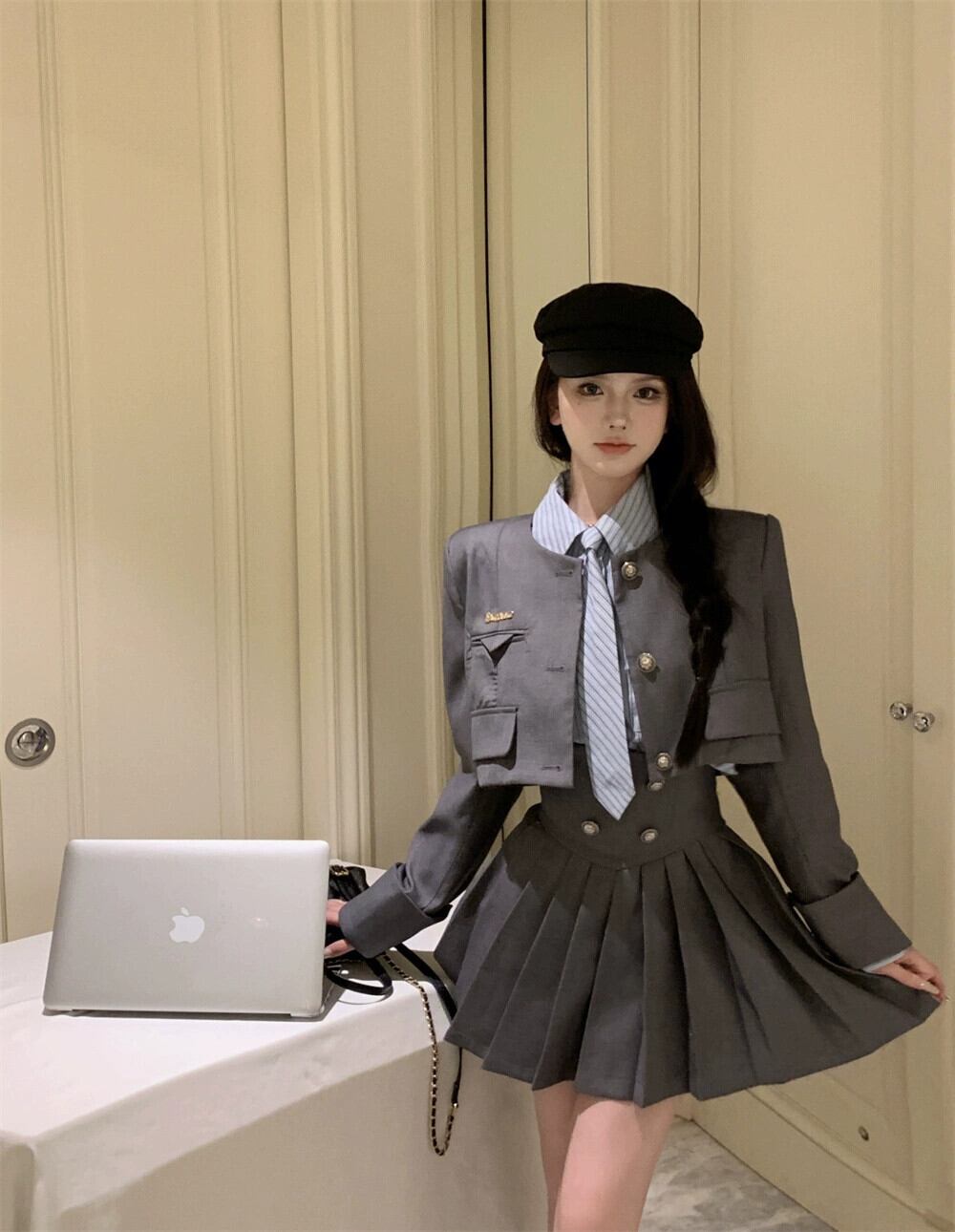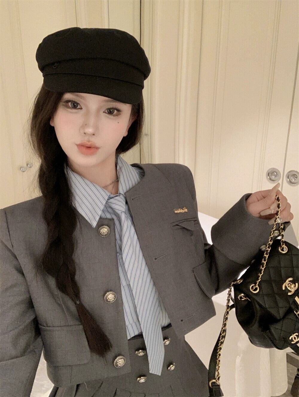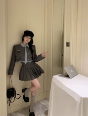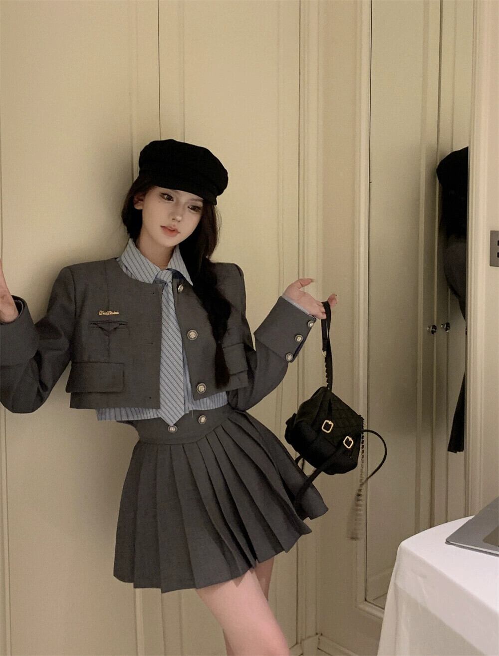 色:グレーのコート+ショートスカート,ブルーストライプシャツ