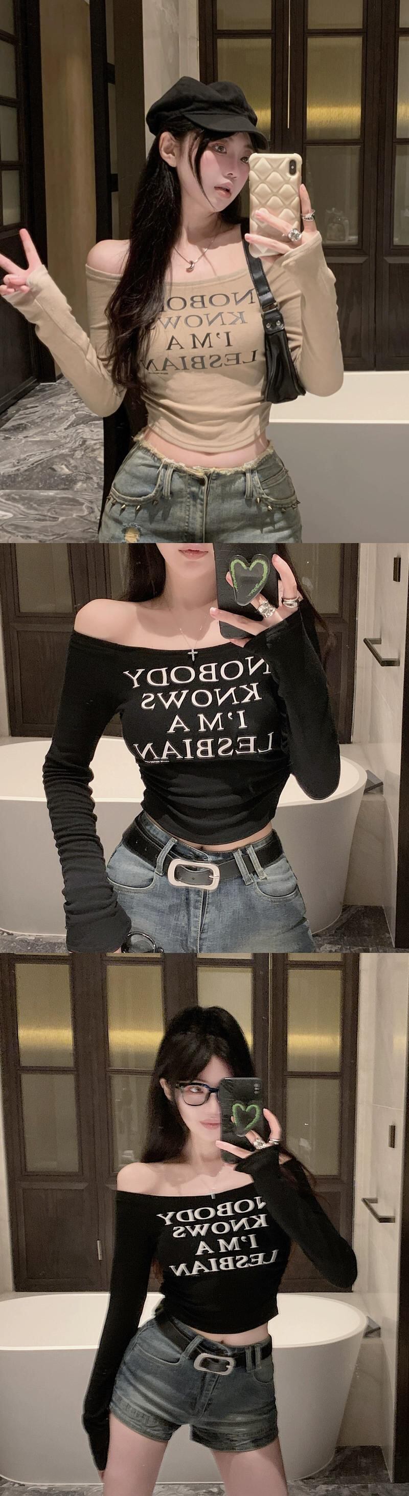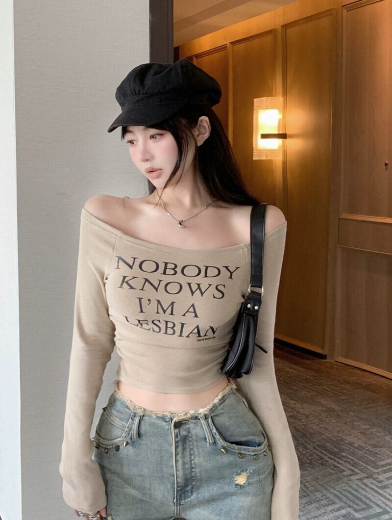 Hot Girl ワンショルダー プリント レター 長袖 Tシャツ レディース スリム フィット ショート ボトリング シャツ 初秋 トップ ロング オータム 秋物 nana47859890806 | modepoisson