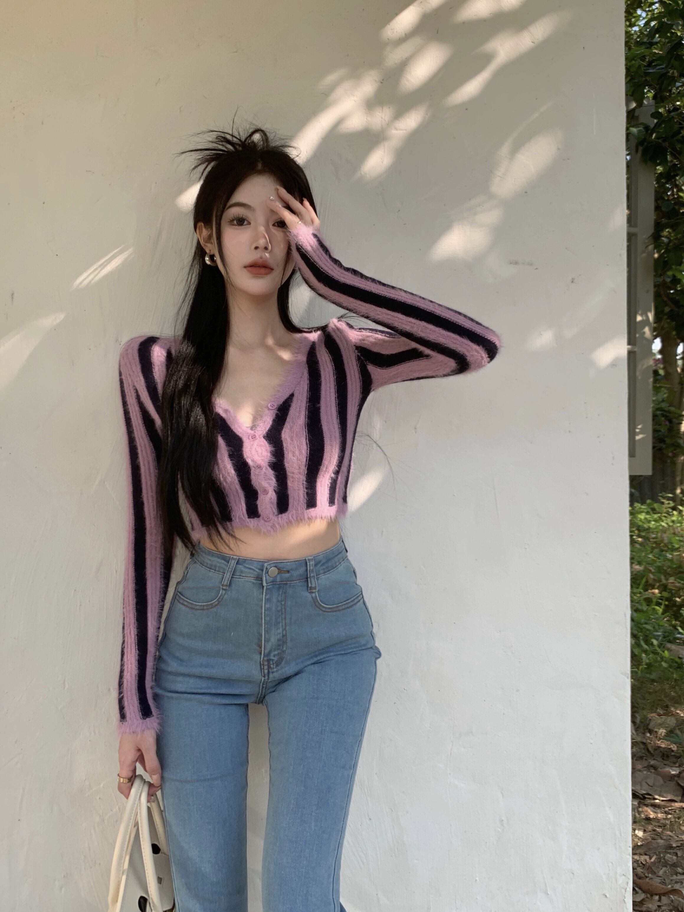 甘いスタイル V ネック ストライプ パッチワーク セーター 初秋ハイウエスト ショート ファーリー長袖ニット カーディガン トップ ロング 大人ガーリー スウィート キュート カジュアル オータム 秋物 Vネック nana73094683205 | modepoisson