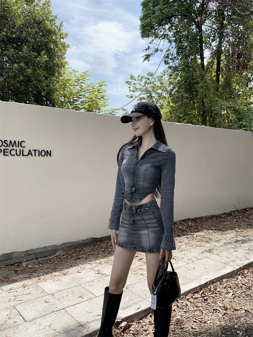 色:ブラックグレートップ,レトロなブルーのトップス,ブラックグレーのスカート,レトロな青いスカート