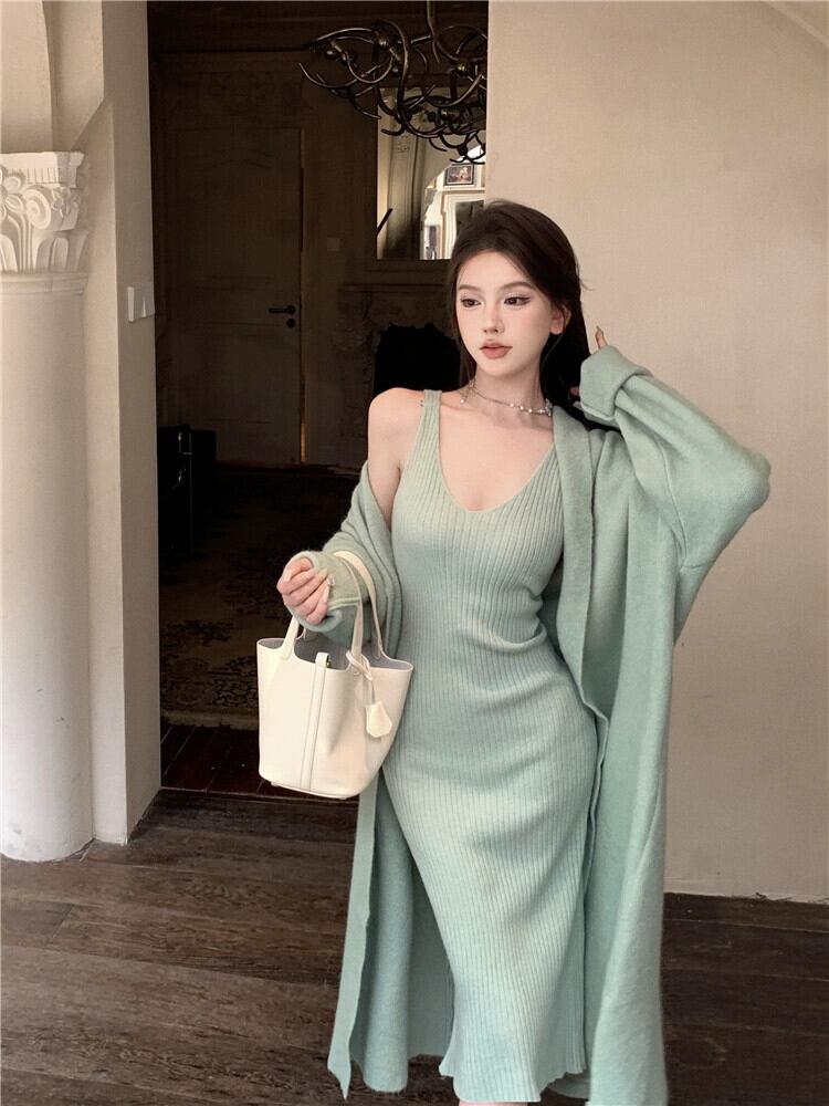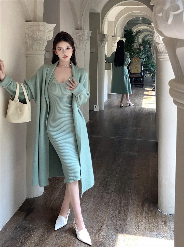 フレンチスリムフィットサスペンダーワンピース、高級2点セット、長袖カーディガン、今年人気の秋レディースのきれいめスーツ ロング オータム 秋物 nana75736410649 | modepoisson