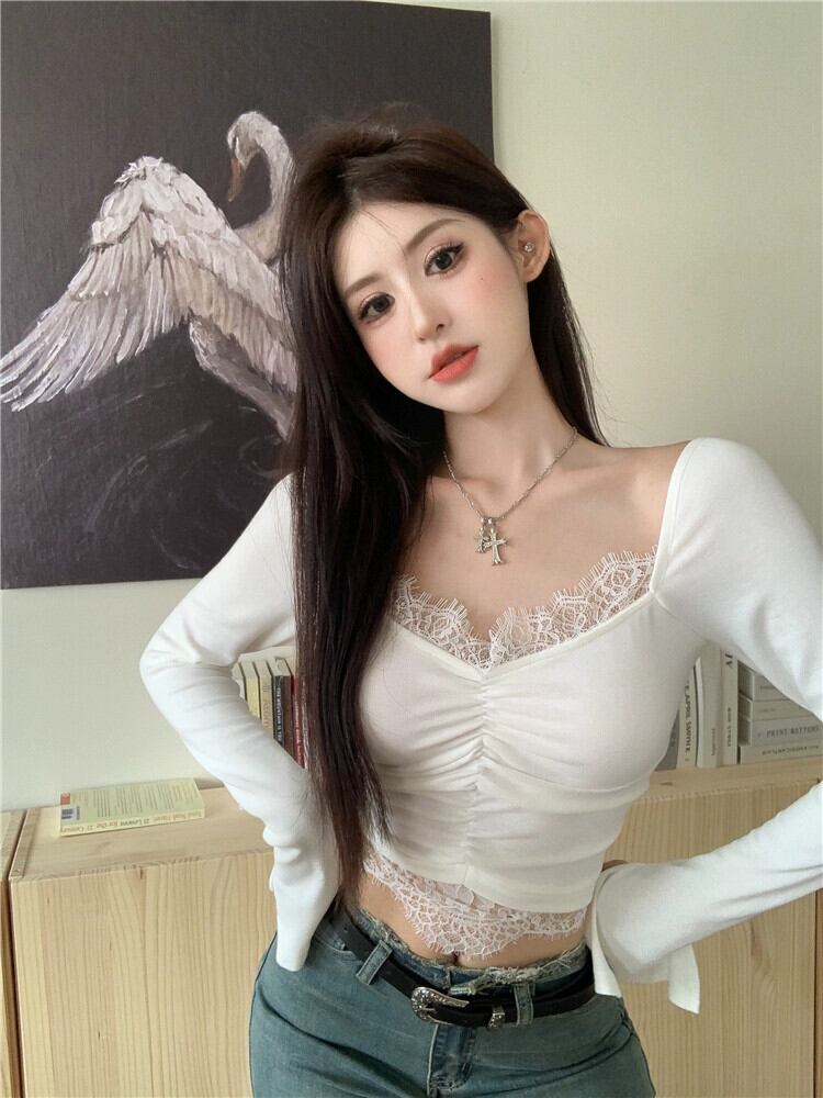 スリムフィットの白い T シャツ、V ネックのレースのスプライシング ショート ボトム シャツ、セクシーなタイトな長袖トップ ロング ホワイト Vネック Tシャツ nana97485216235 | modepoisson