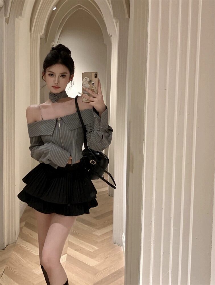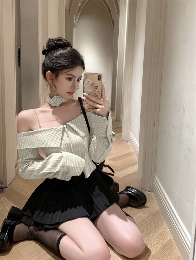 色:黒スカート,グレーのシャツ花柄ホルターネック,アプリコットシャツフラワーホルターネック