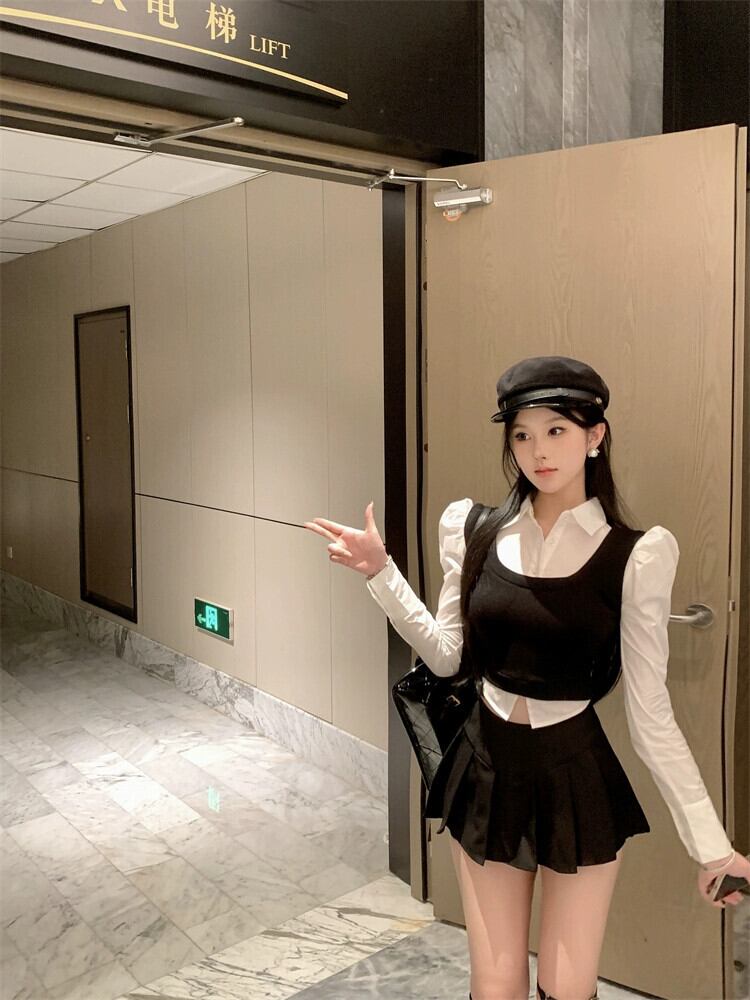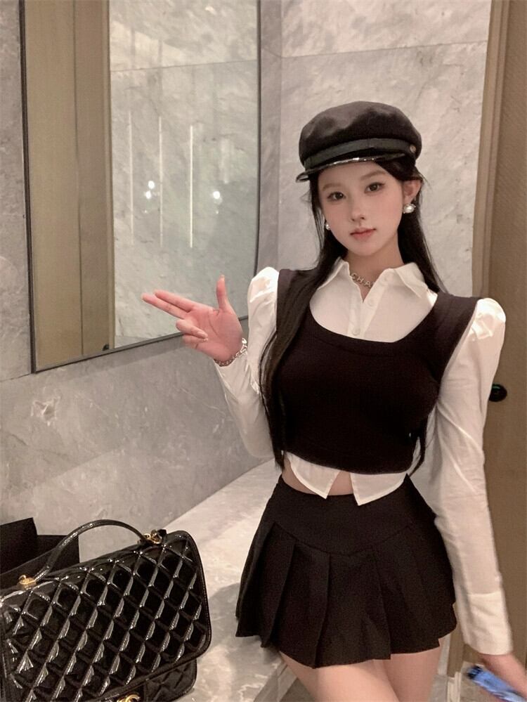 ホットフェイクツーピース長袖シャツ、ハイウエストスカート、プリーツスカート、今年人気の美しいスーツの女性、新しい秋のスタイル ロング オータム 秋物 nana98049538664 | modepoisson