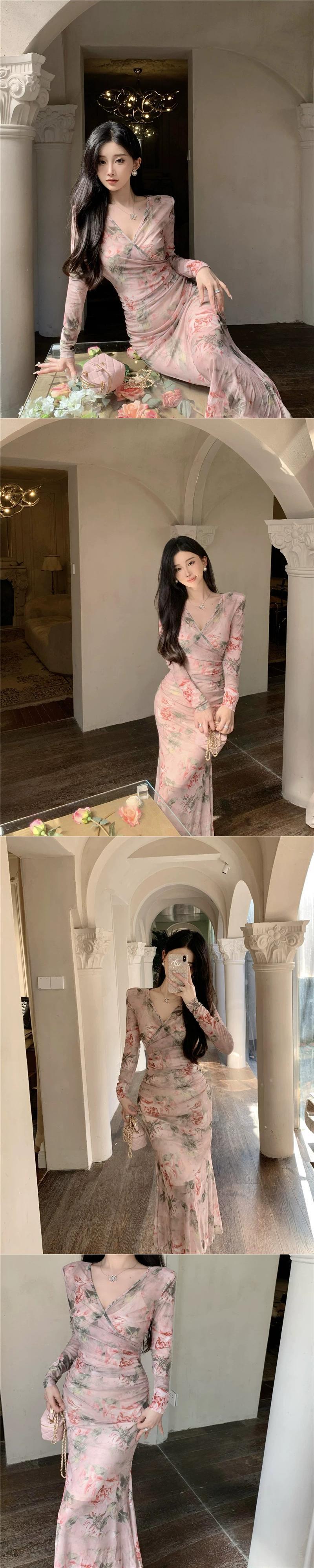 レトロな新中国風のドレスの女性初秋の光と成熟したスタイルの v ネック痩身スカートメッシュフィッシュテールロングスカート オータム 秋物 Vネック nana18668741411 | modepoisson