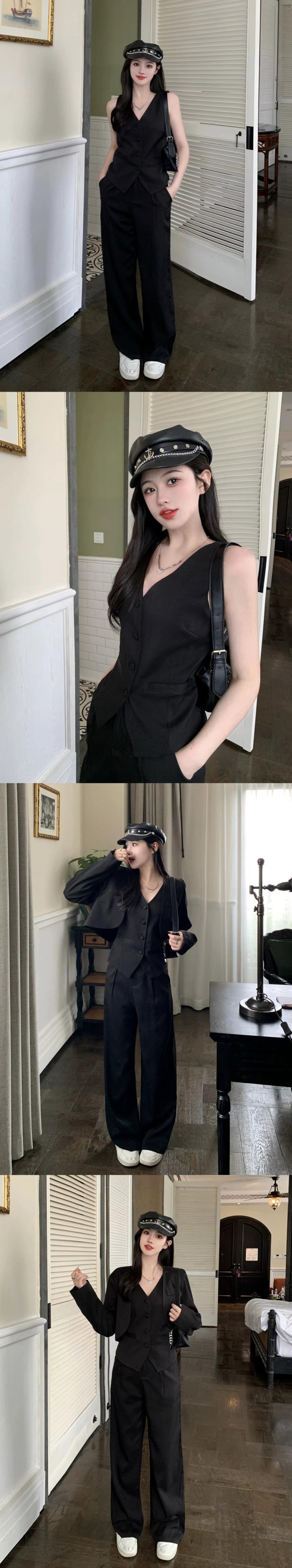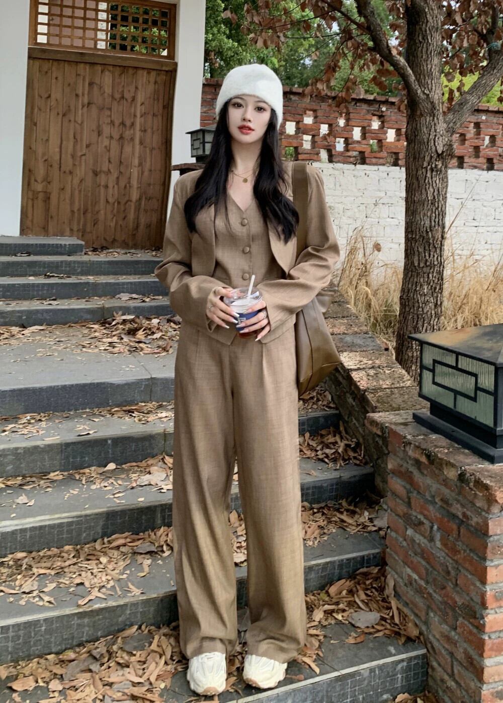 色:コーヒーズボン,コーヒーベスト,コーヒー色のカーディガン,黒いズボン,黒のベスト,ブラックカーディガン