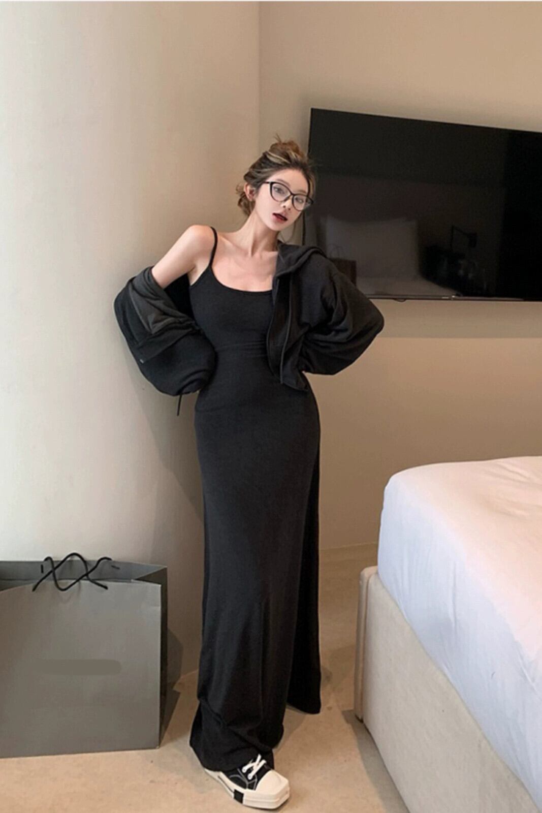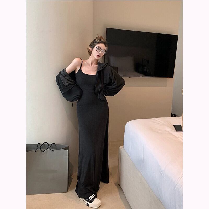 ヨーロッパとアメリカのダークグレーカーディガンフード付きスウェットシャツサスペンダーロングドレスツーピーススーツ女性初秋の新しい婦人服 オータム 秋物 ヨーロピアン nana7823923599 | modepoisson