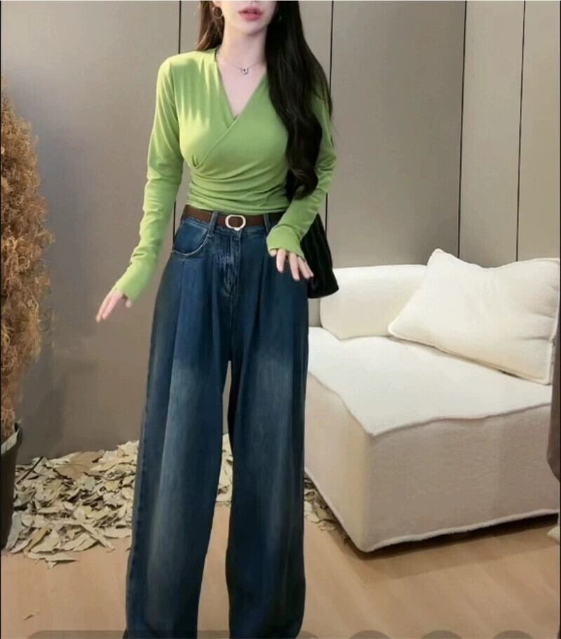 フランスのデザイン、多用途の V ネック長袖ウエスト痩身 T シャツハイウエスト ワイドレッグ ルーズ ジーンズは初秋の女性に適しています。 ロング オータム 秋物 Vネック Tシャツ nana55319605226 | modepoisson