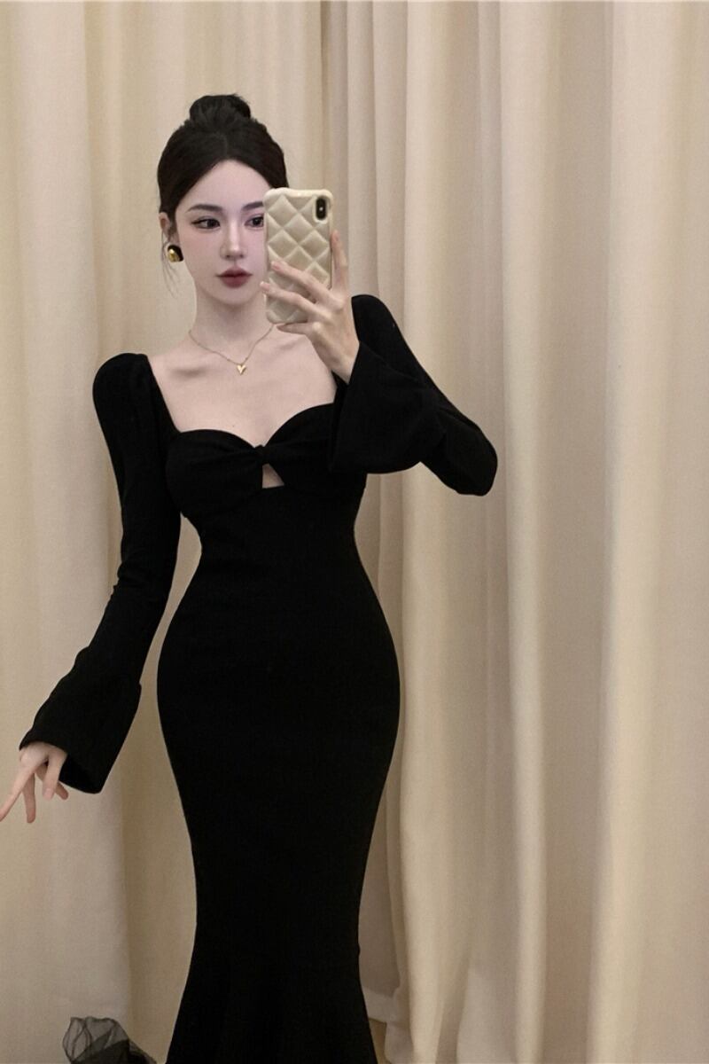 フレンチレトロエレガントスタイルニッチドレス女性の秋と冬のセクシーなワンショルダースカート気質黒長袖ロングスカート ブラック オータム 秋物 ウィンター 冬物 nana64024859559 | modepoisson