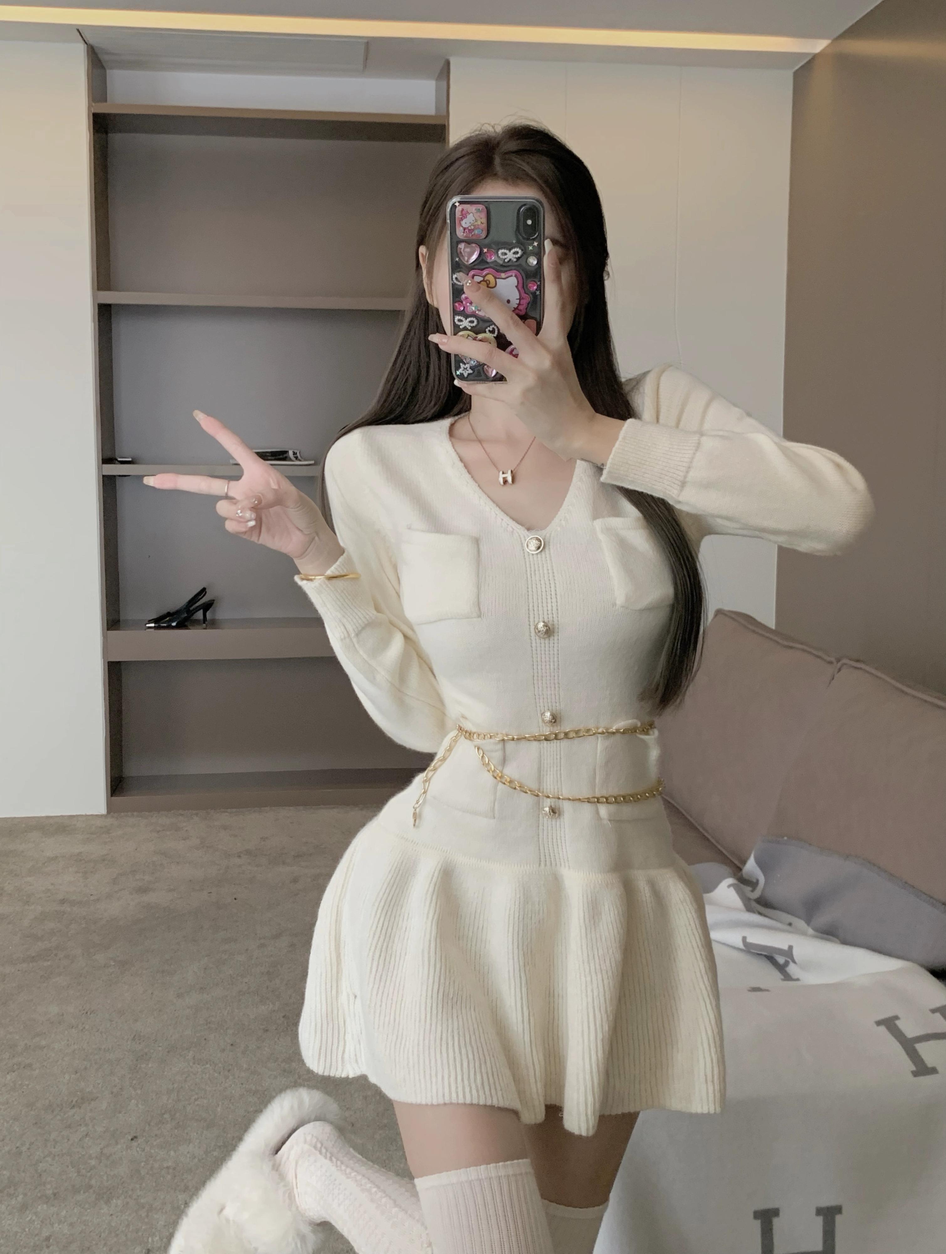 Pure Desire V ネックスリムドレス女性の初秋 2023 フレンチ長袖ウエストスリムパフショートスカート ロング オータム 秋物 Vネック nana23118762039 | modepoisson