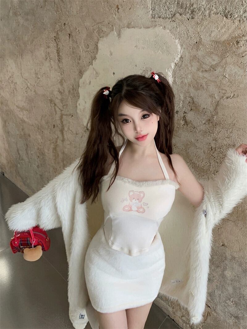 クリームソフトワックス状模造ミンクベルベット甘いニットカーディガンウォームトップクマベストハイウエストスカートスーツ女性 ハイウェスト 大人ガーリー スウィート キュート カジュアル nana73678354458 | modepoisson