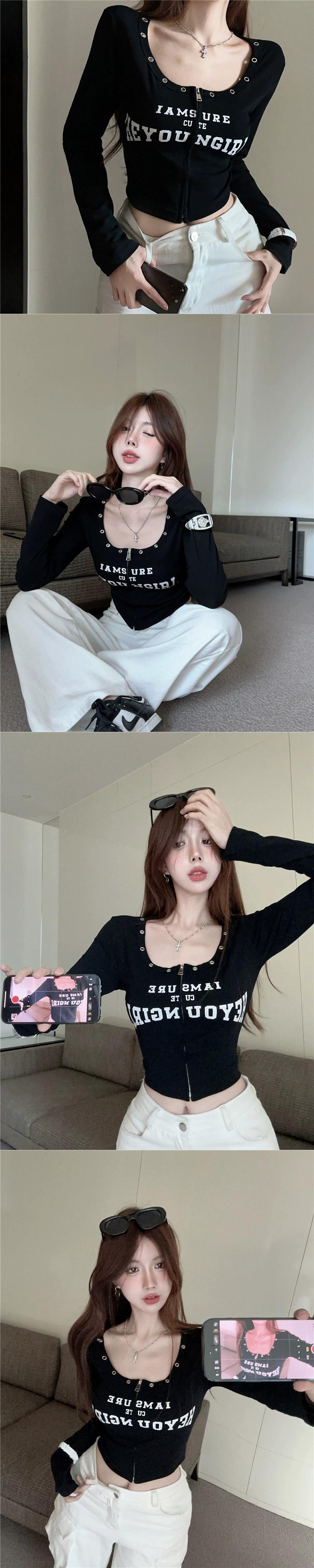 香港スタイルのレトロなオールマッチスリムジッパープリントへそ出しアウター U ネック長袖 Tシャツトップ女性 2023 秋の新スタイル ロング オータム 秋物 nana96615535460 | modepoisson
