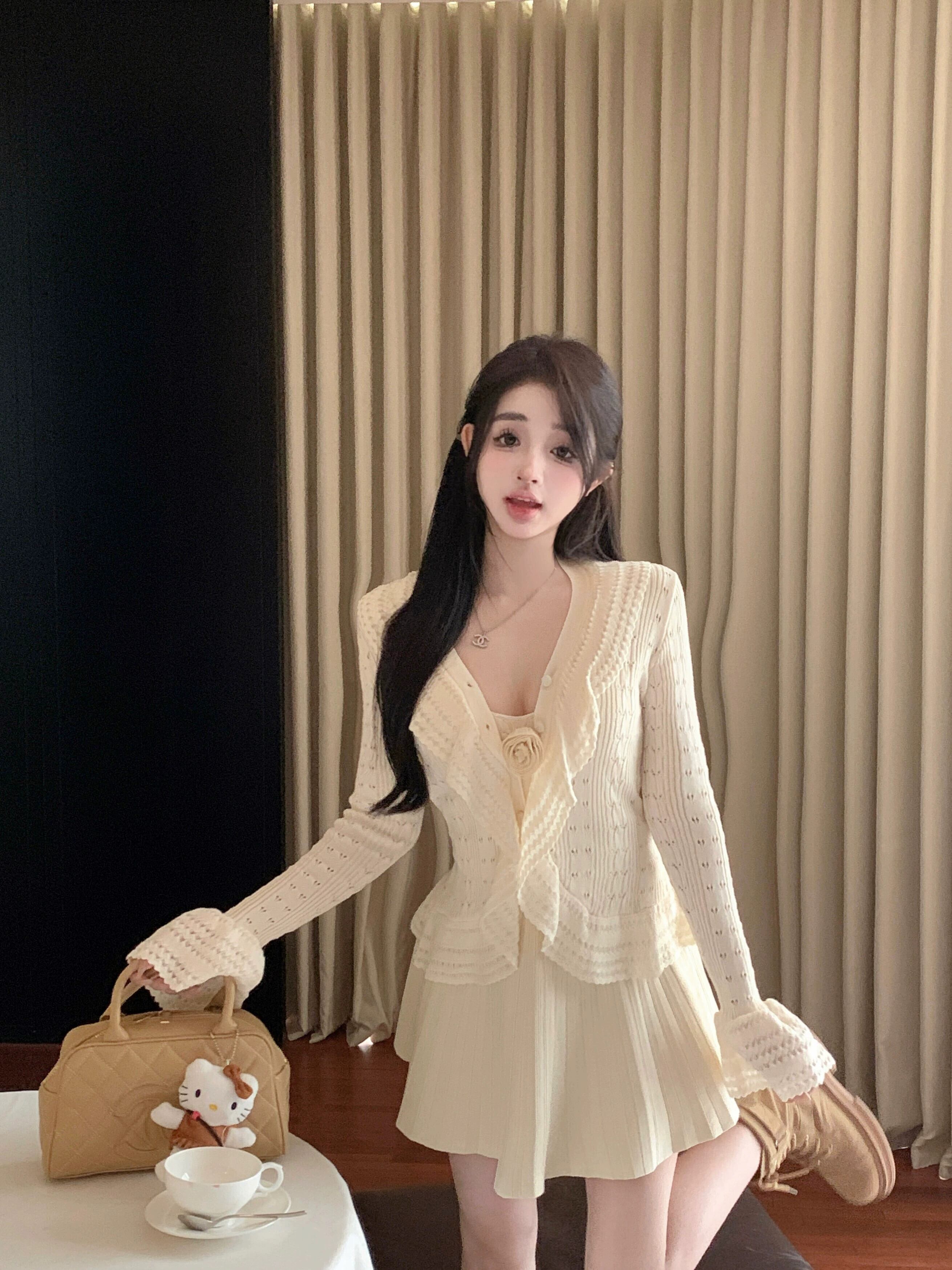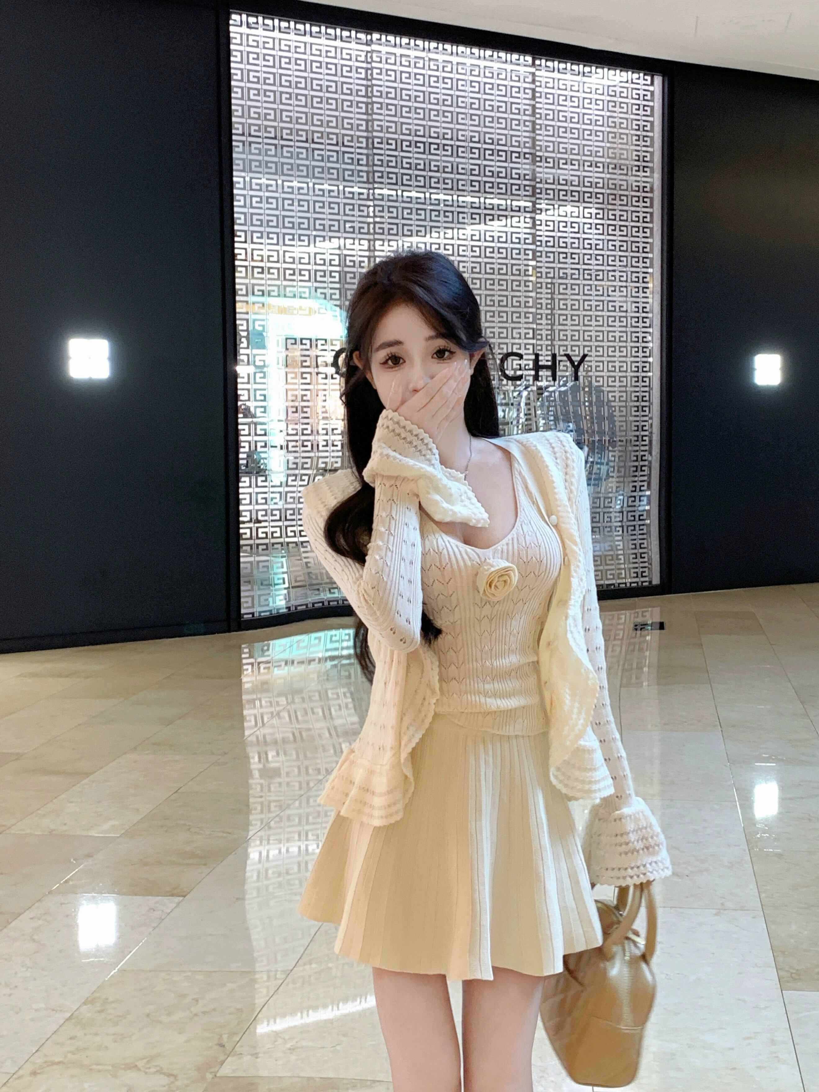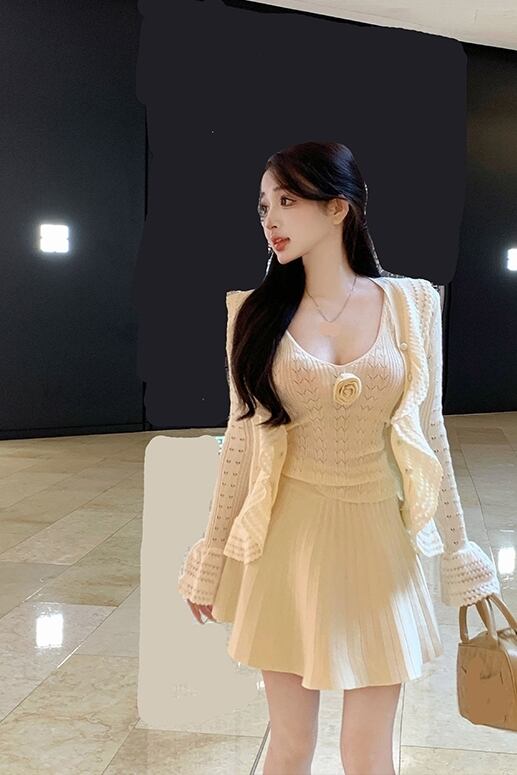 色:ニットカーディガン,ローズベスト,プリーツスカート