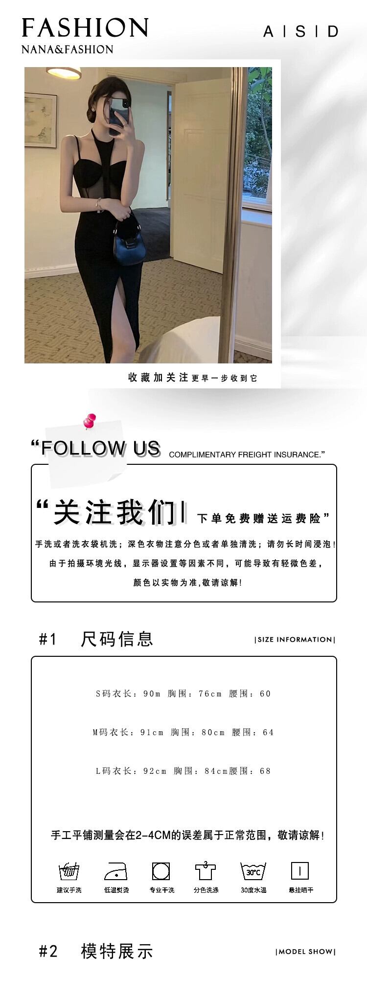 黒のホルターネックサスペンダードレスの女性の夏のメッシュスプライシングで体型を見せますスリットミッドレングススカート ブラック サマー 夏物 nana43350622765 | modepoisson