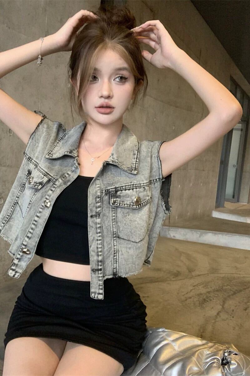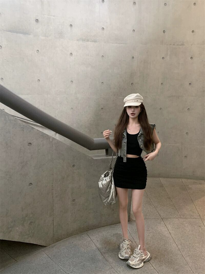 ホットセクシーなスーツスカート女性レトロデニムベストサスペンダーヒップハーフレングスショートスカートファッショナブルなスリーピースサマースーツ 夏物 nana5643194209 | modepoisson