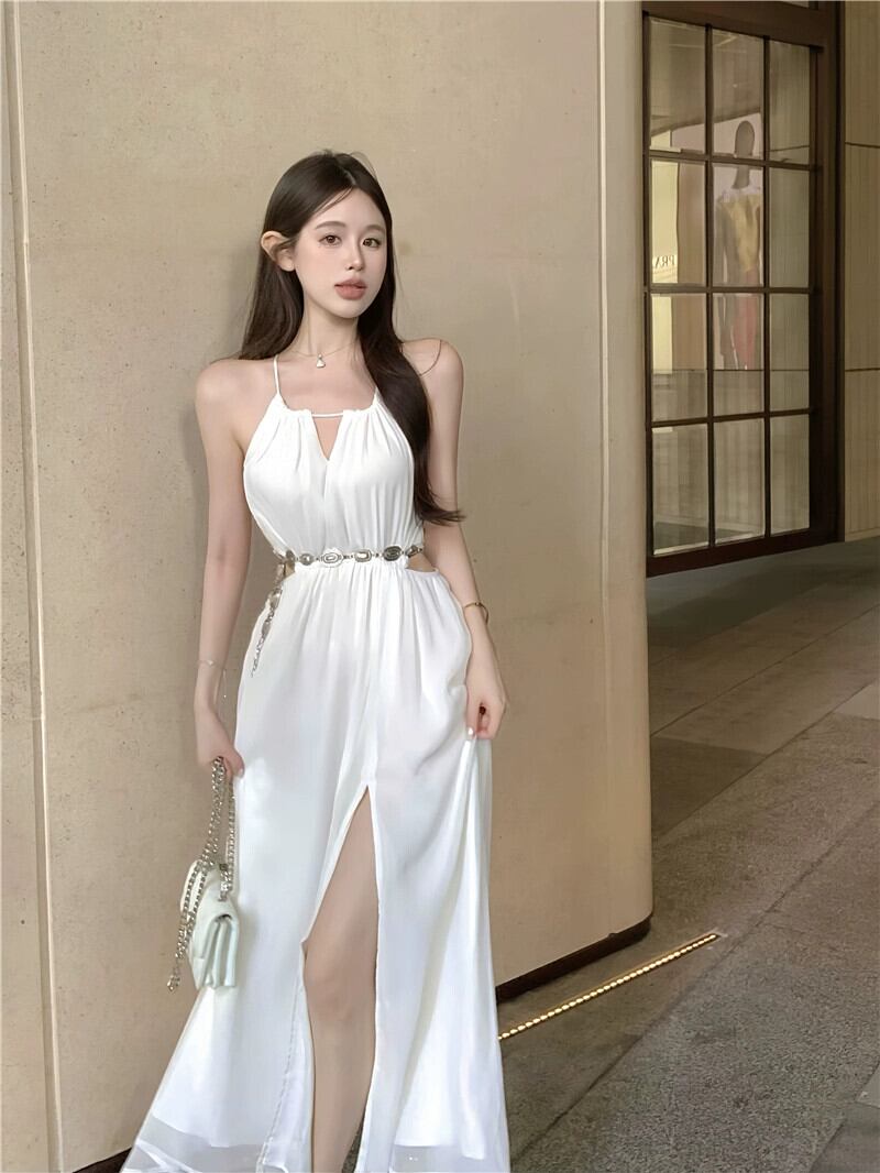 フレンチホルターネックノースリーブドレス重工業中空甘いホリデースタイルロングスカート女性の夏の新しいサスペンダースカート 大人ガーリー スウィート キュート カジュアル サマー 夏物 nana94533837574 | modepoisson