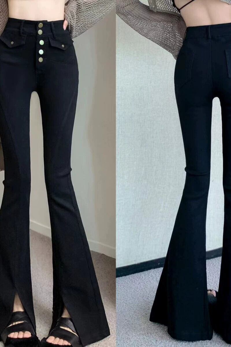 夏のスリムカジュアルパンツ女性、黒のハイウエストマイクロフレアパンツ、スリムスリットパンツ、ワイドレッグパンツ2023新しいスタイル ブラック サマー 夏物 nana42626799987 | modepoisson