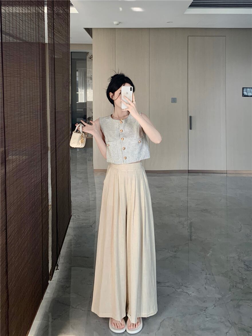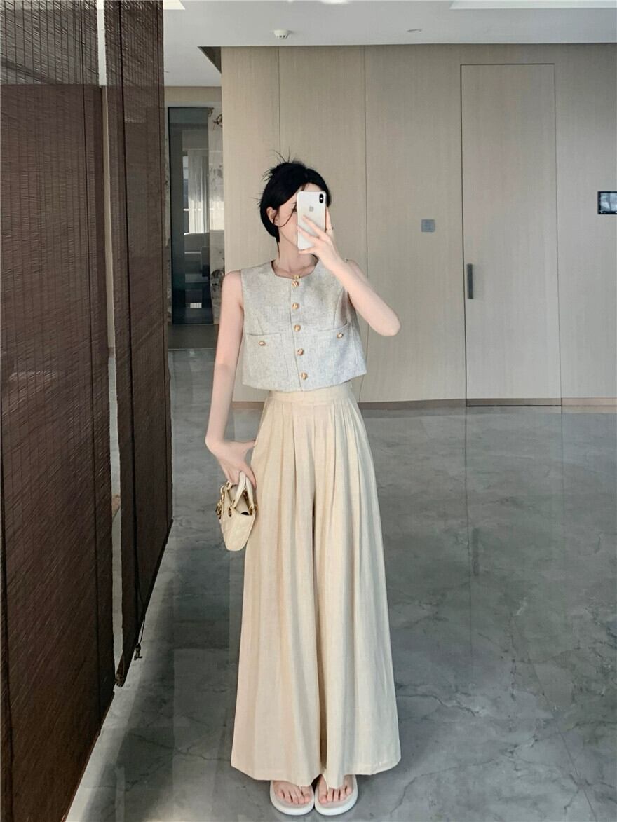 フランスのゆったりとしたショートベスト、ハイウエスト、痩身、ワイドレッグ長ズボン、ファッショナブルなツーピーススーツの女性、新しい夏のスタイル ハイウェスト ロング サマー 夏物 nana11257814755 | modepoisson