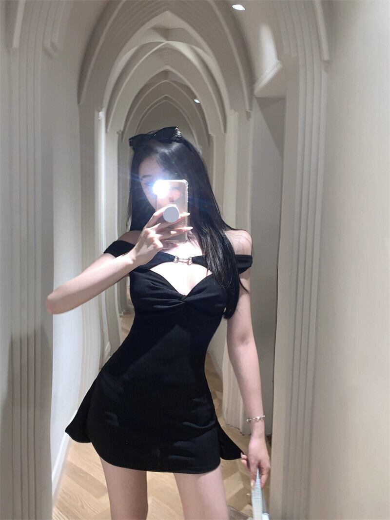 ワンショルダー中空ノースリーブドレス女性の夏の新しいスタイルのウエスト痩身黒のセクシーなヒップカバーショートスカート ブラック サマー 夏物 nana91379759182 | modepoisson