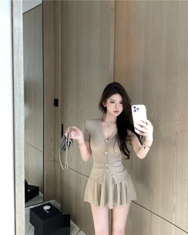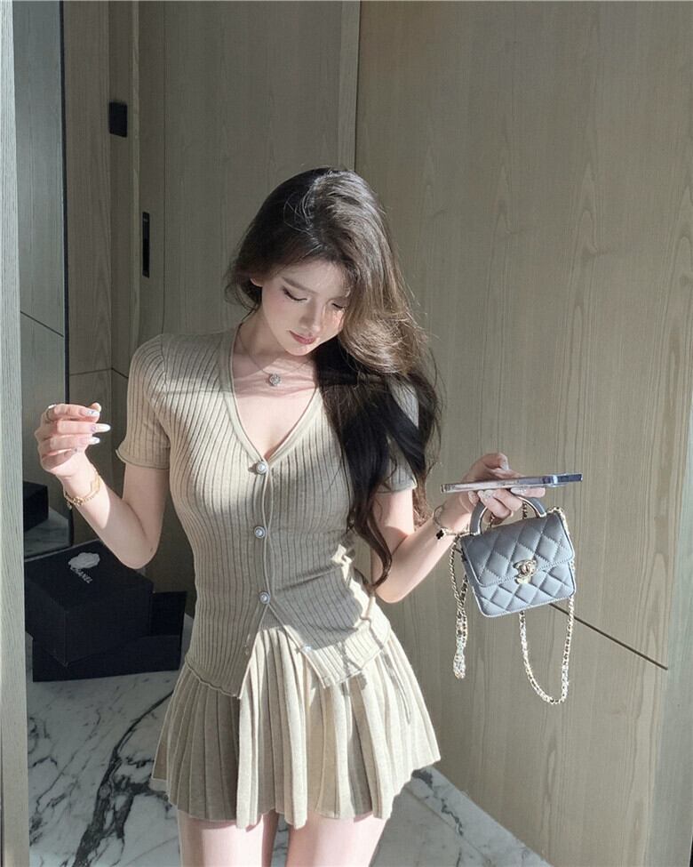 ホット半袖ニットカーディガン痩身ハイウエストプリーツスカートハーフレングスショートスカートスーツ女性の新しい夏のツーピースセット サマー 夏物 nana92138304468 | modepoisson