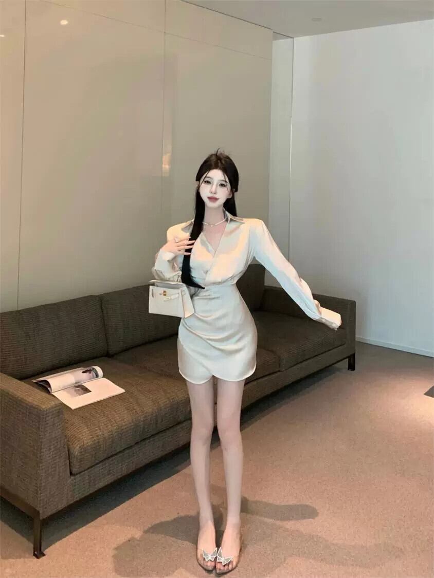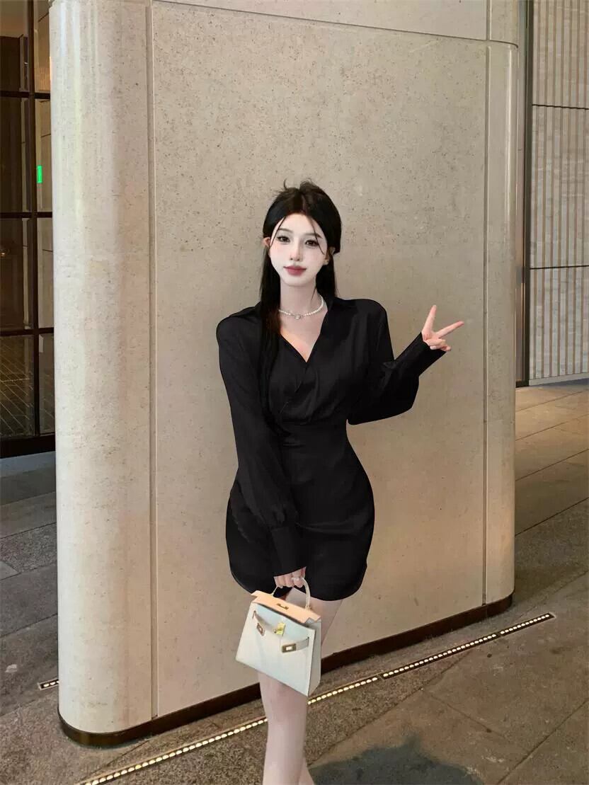 フレンチスタイルの長袖ドレス、不規則な短いスカート、スリムウエスト、痩身、セクシーなお尻を覆うスカート、レディース秋服 ショート ロング オータム 秋物 nana43536716103 | modepoisson
