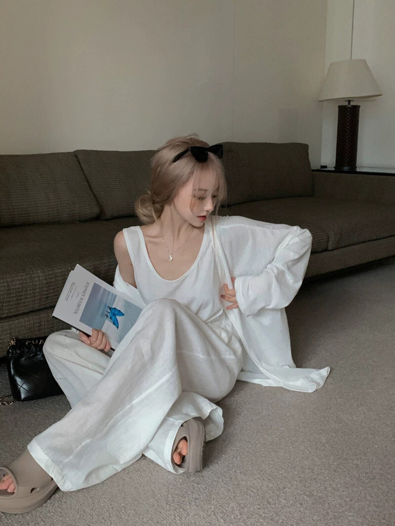 フレンチスタイル怠惰なスタイルベストリネンワイドレッグパンツ日焼け止めカーディガンサマースーツ女性の 2023 新しい 3 点セット 夏物 ワイドパンツ nana82969029041 | modepoisson