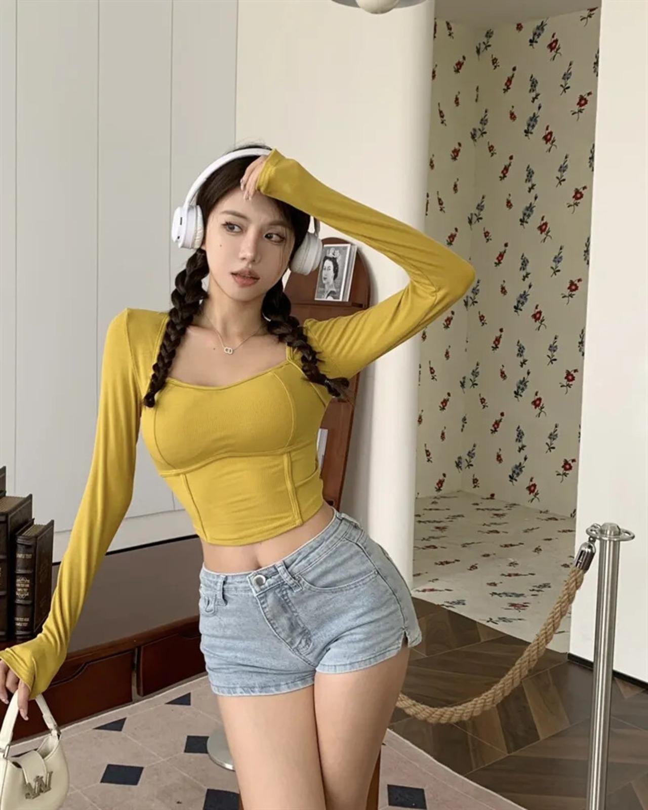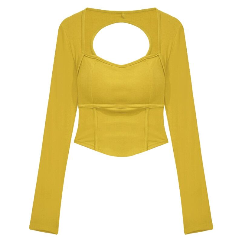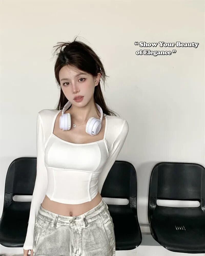 甘いホットガール長袖スクエアネック Tシャツスリム背中の開いたショートユニークなトップ女性 2023 初秋スタイル ロング 大人ガーリー スウィート キュート カジュアル オータム 秋物 スクウェア nana49740871005 | modepoisson