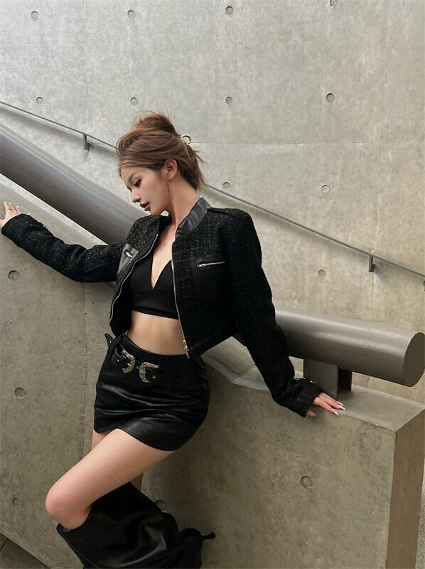 色:ブラックショートコート,レザースカート