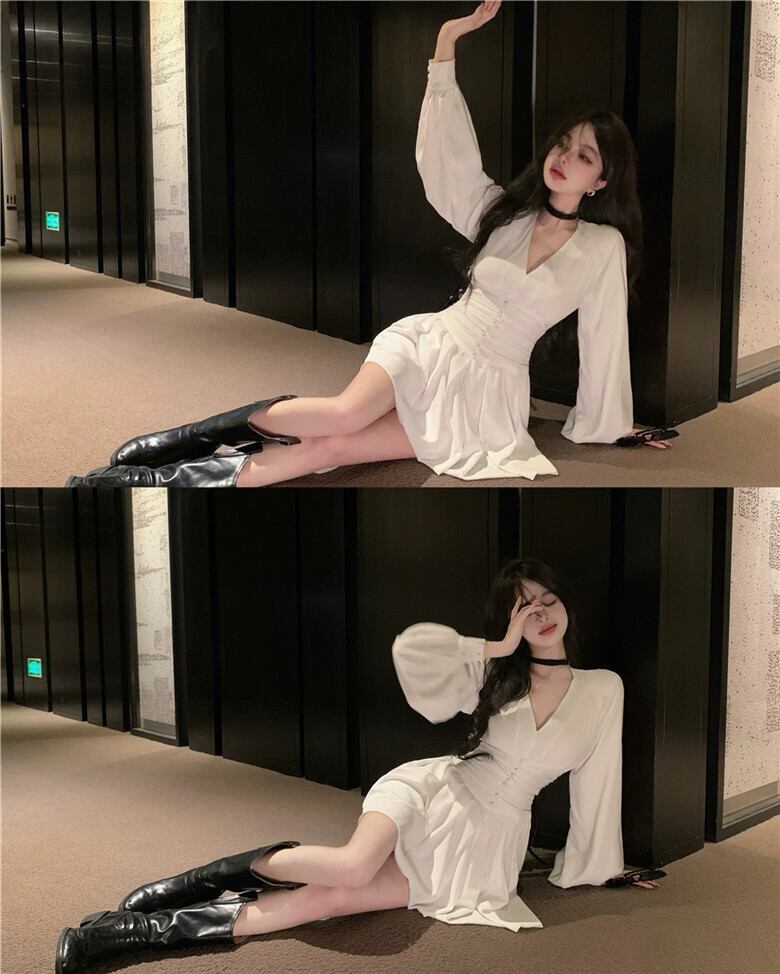 リッチファミリードレス フランスの高級感 ウエスト痩身 長袖 Vネック ショートスカート レディース 初秋の新スタイル ロング オータム 秋物 nana20194852693 | modepoisson