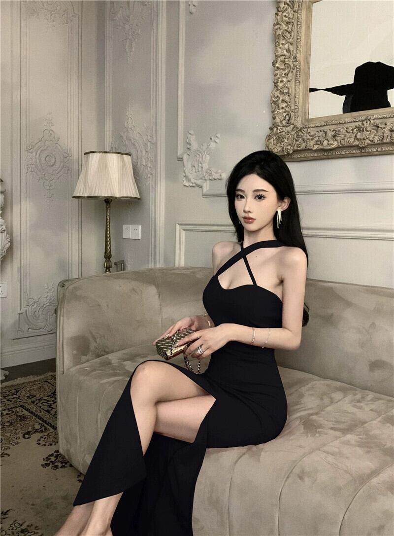 気質サスペンダードレス、純粋な欲望、セクシーなスリットフィッシュテールドレス、ロングスカート、ヘップバーンスタイルの黒のスカート、女性の夏 ブラック サマー 夏物 ピュア nana79375090019 | modepoisson