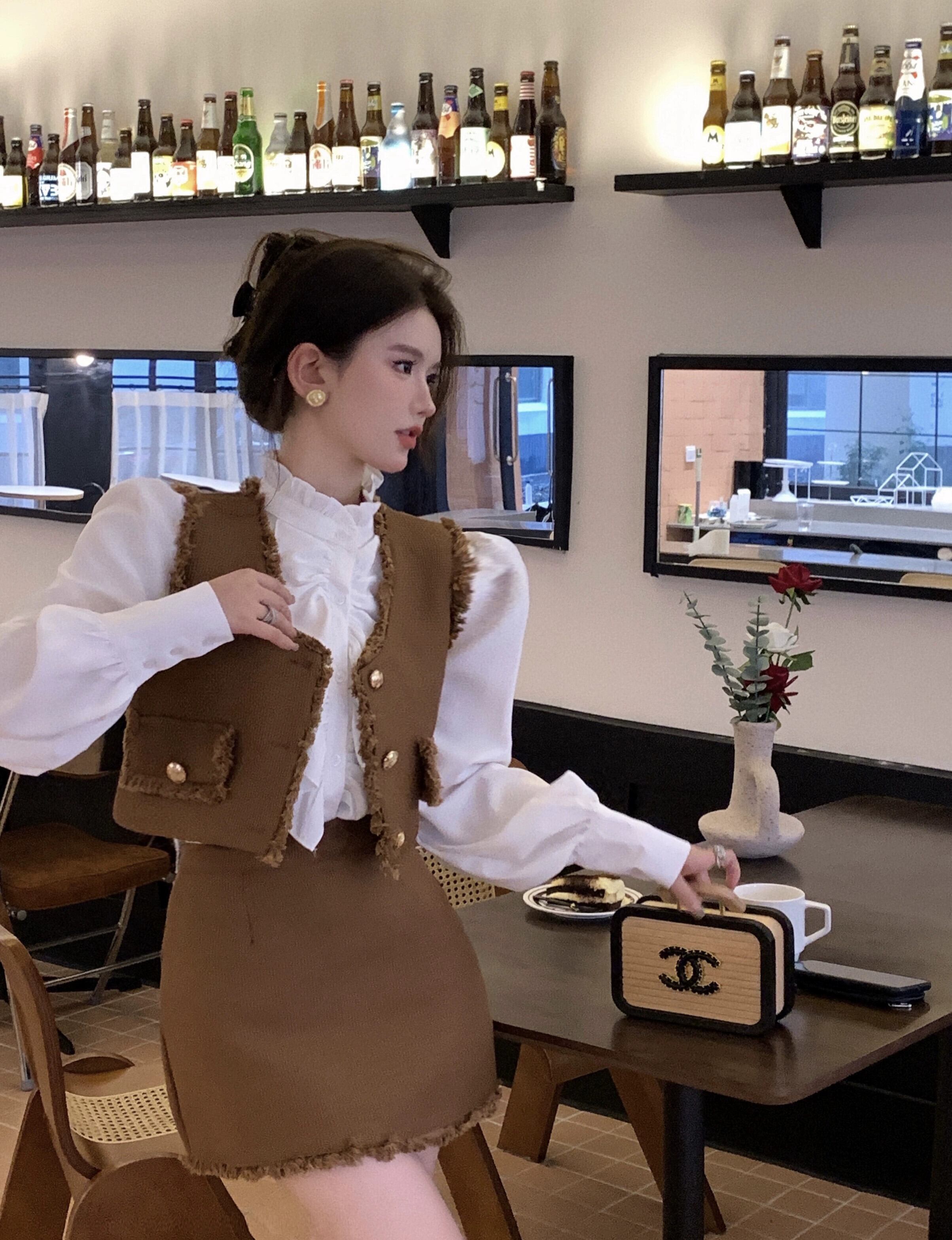 色:白のシャツ,コーヒーベスト+スカート,黒のベスト+スカート