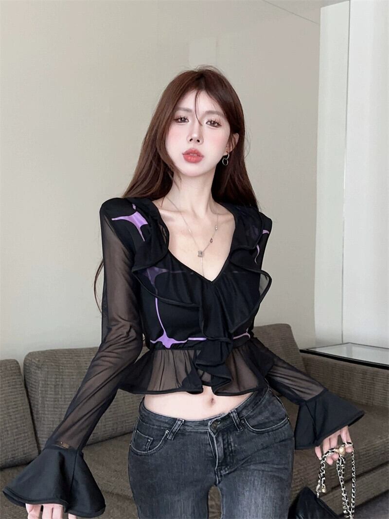 フレンチスイートシフォンシャツ、メッシュベルスリーブ、フリル長袖、ショートトップ、レディース超素敵な秋シャツ ロング 大人ガーリー スウィート キュート カジュアル オータム 秋物 nana24933107202 | modepoisson