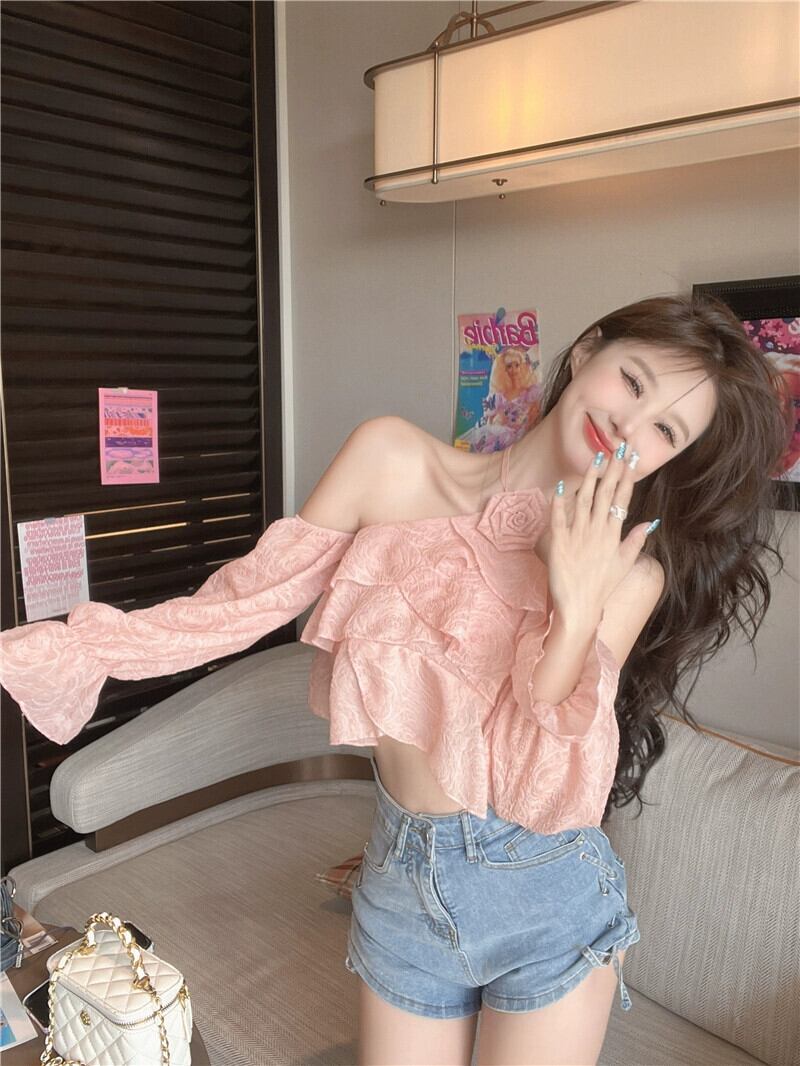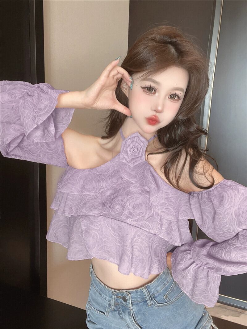 フランスの春と秋のシフォン シャツ、甘いオフショルダー ホルター トップ、フリル付きレディース長袖ショート プリント シャツ ロング 大人ガーリー スウィート キュート カジュアル スプリング 春物 オータム 秋物 nana43765892182 | modepoisson