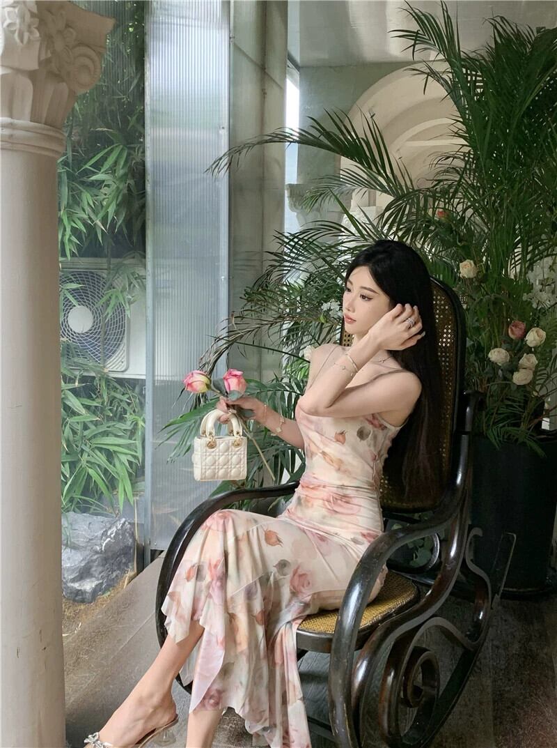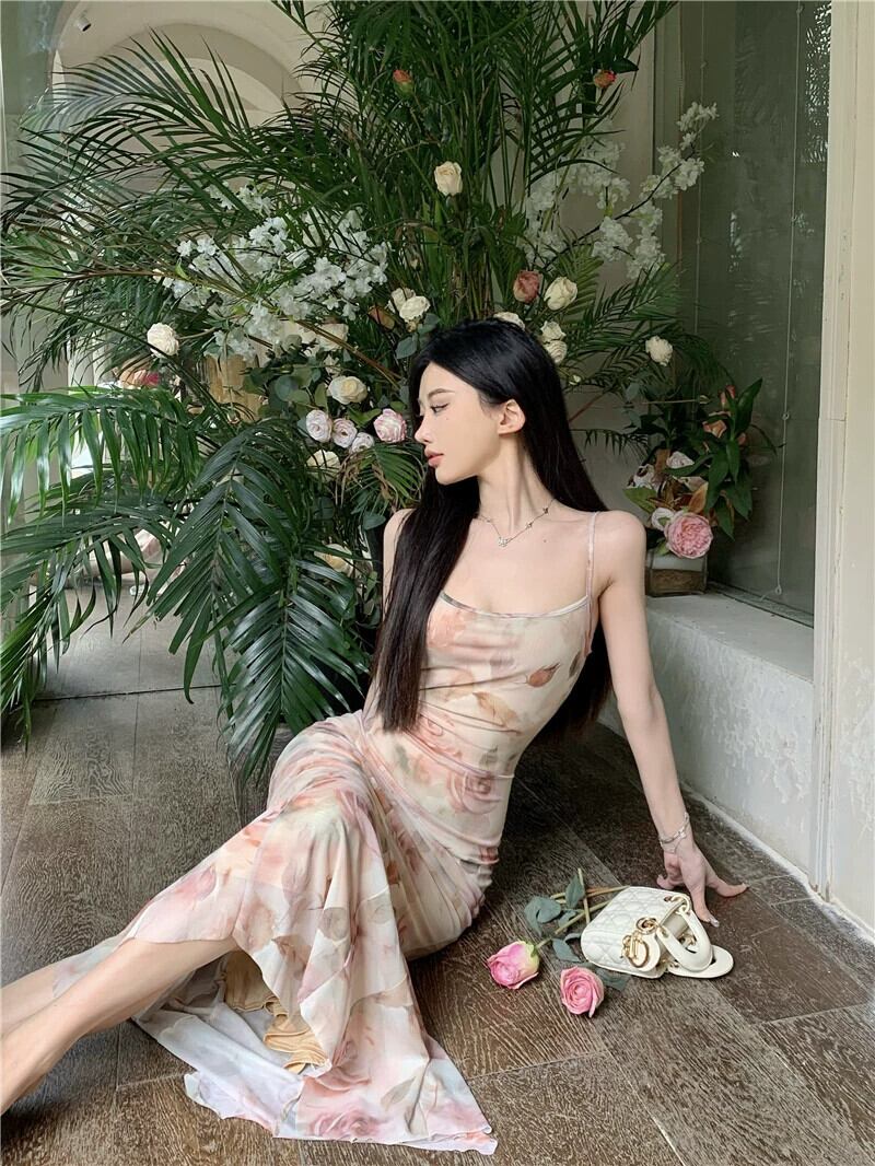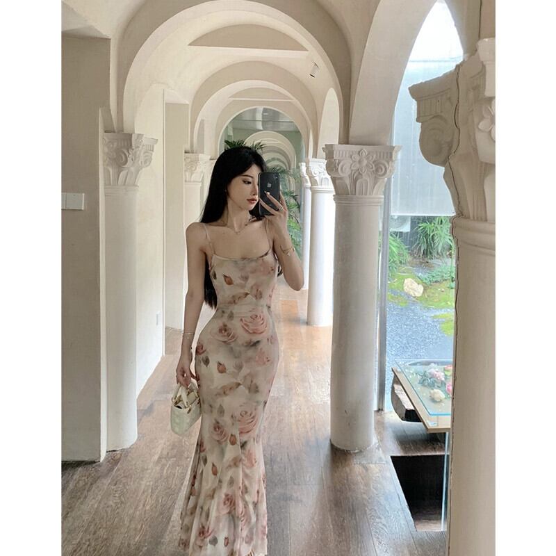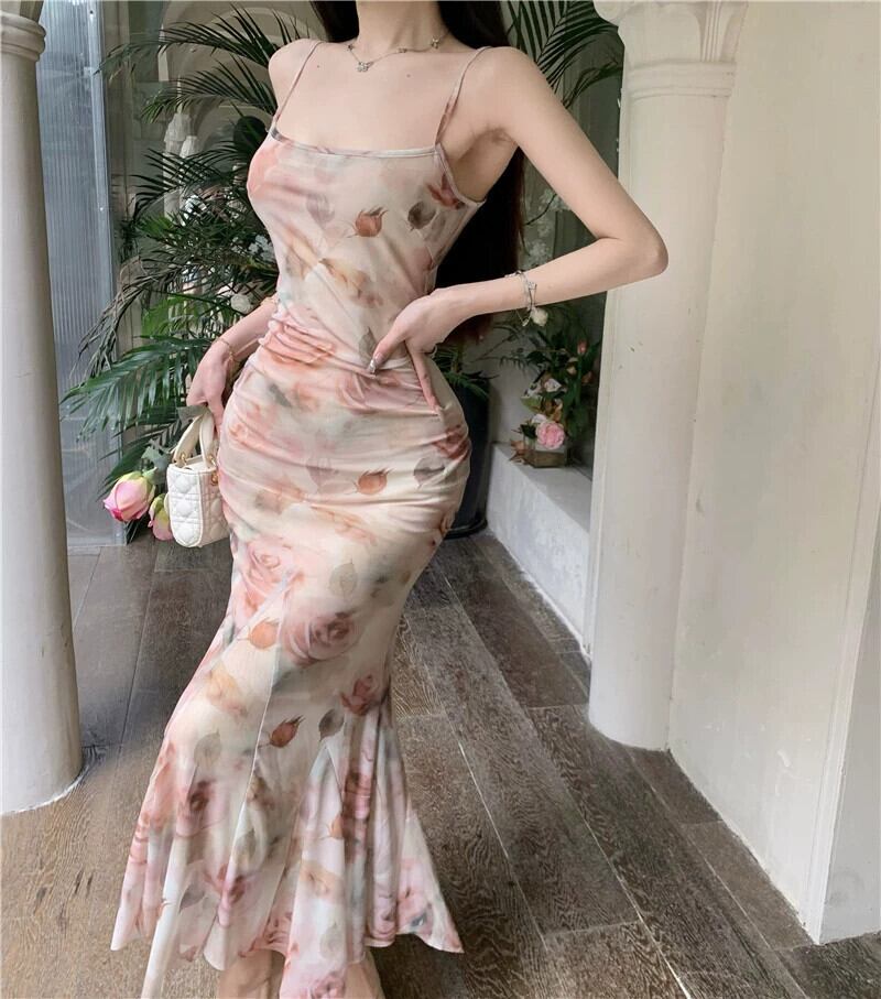 ノースリーブサスペンダーフィッシュテールドレス女性の夏の純粋な欲望セクシーなファッション新しいスカートプリント気質ロングスカート サマー 夏物 ピュア nana40995585030 | modepoisson