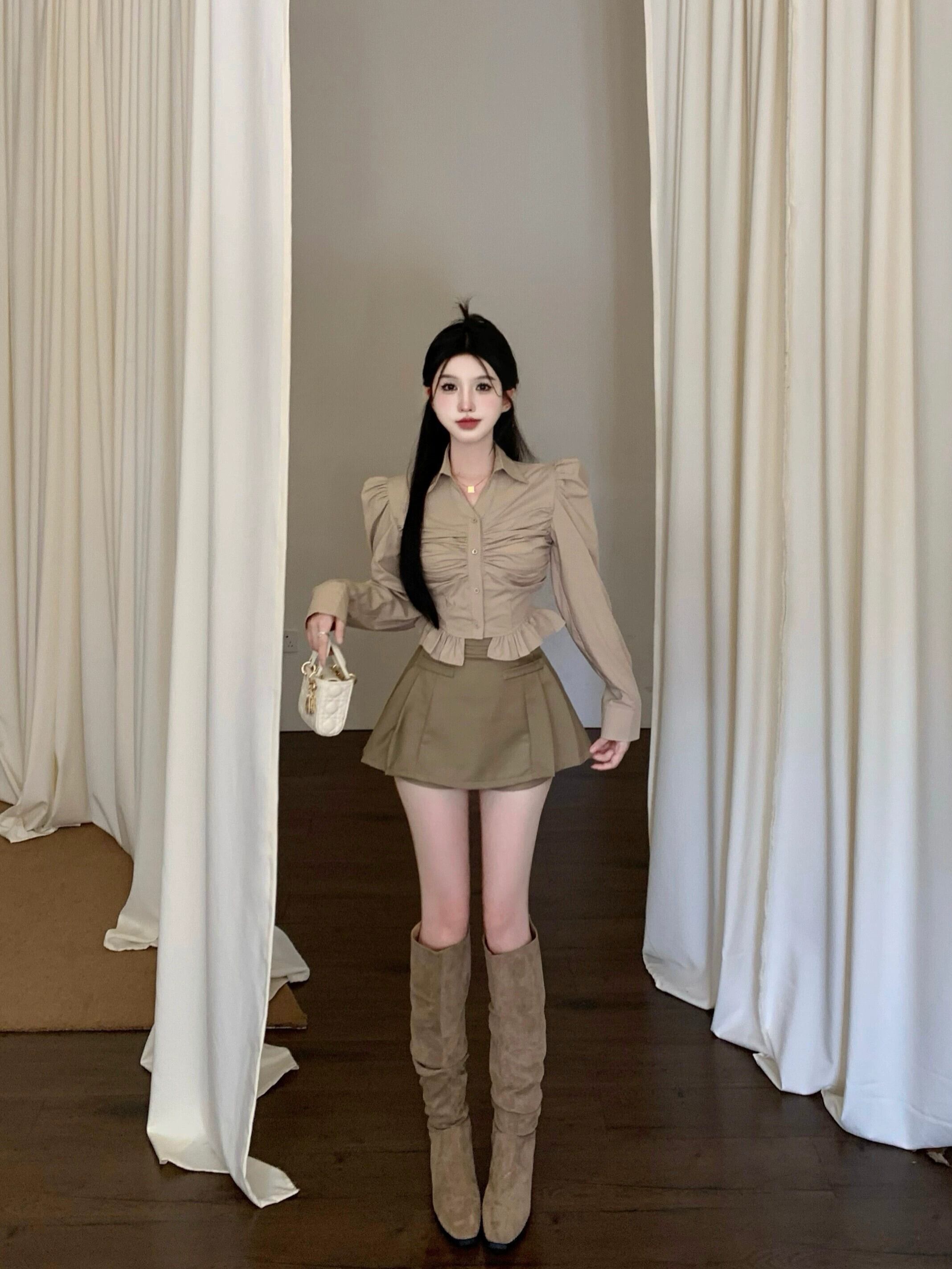 甘辛スリムフィットスーツスカートフリル長袖シャツハイウエストスカート初秋新作2点セットレディース ロング 大人ガーリー スウィート キュート カジュアル オータム 秋物 nana37070514295 | modepoisson