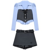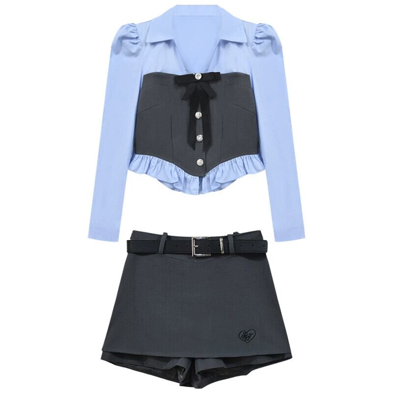 アメリカンキャンパススーツスカート、甘くてスパイシーな純粋な欲望スタイルのパフスリーブフェイクツーピースシャツハイウエストハーフパンツスカートレディース秋 ハイウェスト 大人ガーリー スウィート キュート カジュアル オータム 秋物 ピュア nana33104569876 | modepoisson