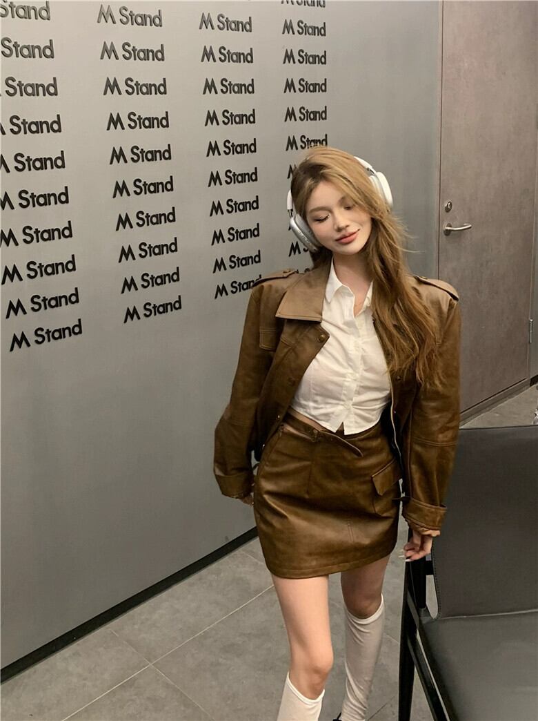 色:コーヒーカラーのレザージャケット,コーヒー色のスカート