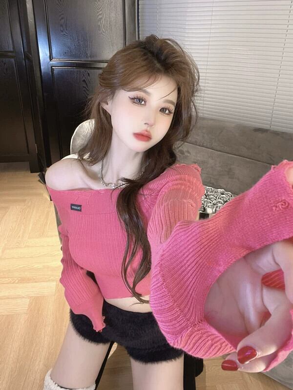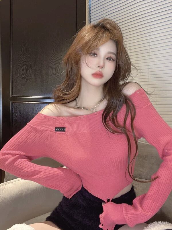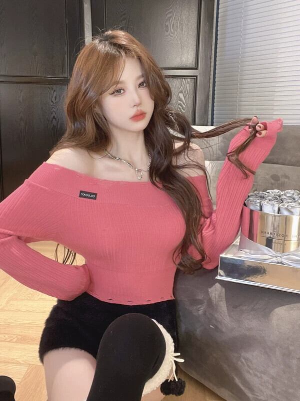 ED ホールインワンショルダー ショート ニッチ スリムフィット ニット セーター インナー レイヤード トップス 長袖 Tシャツ レディース 初秋 ロング レッド オータム 秋物 nana43201223749 | modepoisson